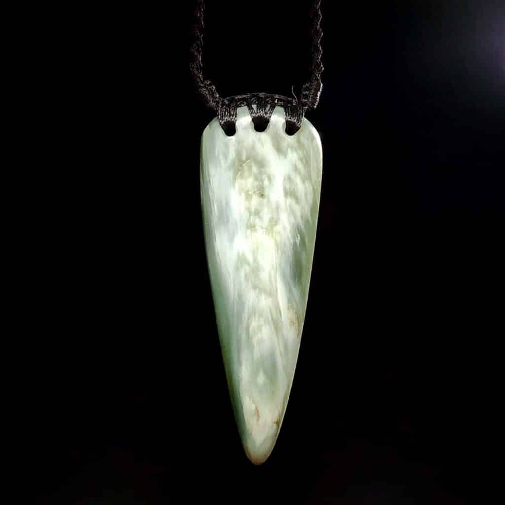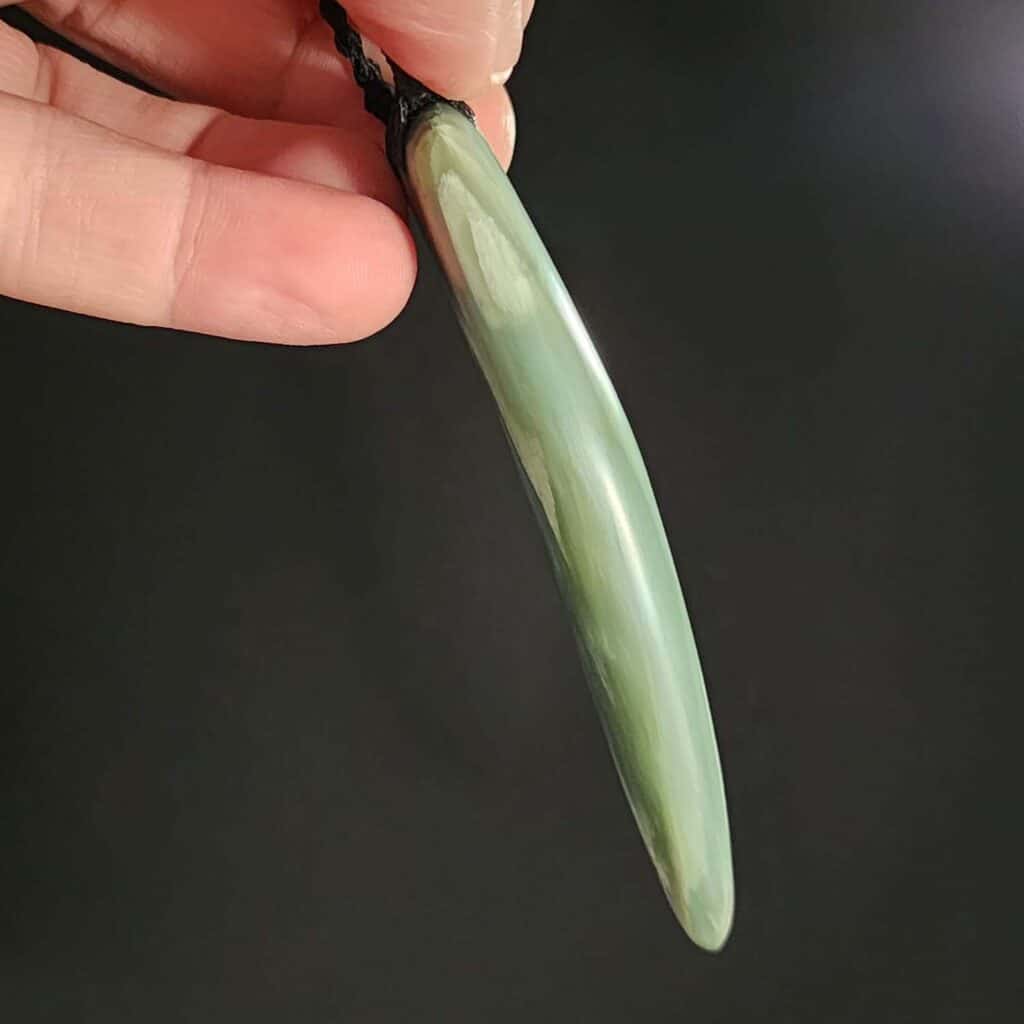 It’s a long, narrow pendant, 90mm tall and just 30mm across at the top, with a clean symmetrical form that takes inspiration from the niho, or tooth. The niho symbolises protection, strength, and determination – qualities that continue to resonate through taonga like this in te ao Māori.