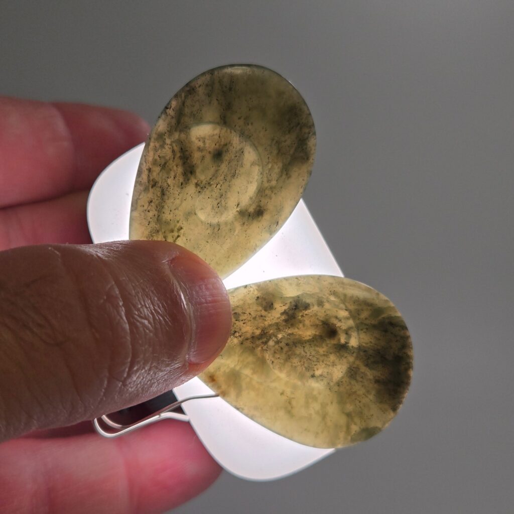 There was a real focus on consistency in this pair, keeping the proportions, curves, and carved elements even across both pieces so they sit well together when worn. Small variations in the stone give each one its own character, but they remain clearly connected as a set.