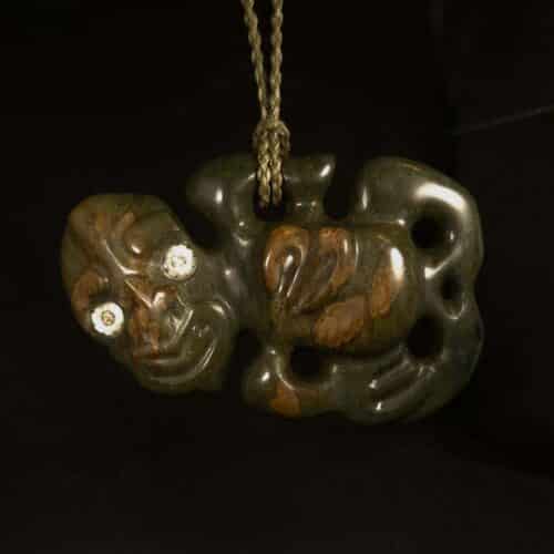 This 95mm Hei Tiki is carved from beach serpentine Pounamu I sourced near Hokitika. It features a side-hanging design with paua inlaid eyes and a harakeke-coloured 4-braid cord through the arm. The deep moss green stone has tan highlights from the original skin of the stone on the face, belly, and hand. Hei Tiki are rich in tradition, symbolising whakapapa, fertility, and ancestral strength.