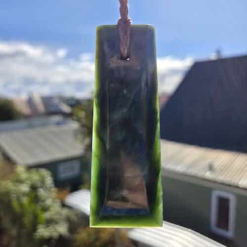 Pounamu pendant with glowing pale to mid-green tones, a sharp point, and a strong ridge down each side. Finished with a three-hole ring bolt lashing and tan cord, it embodies the enduring qualities of resilience and guardianship.