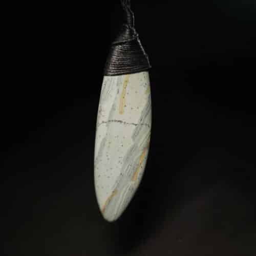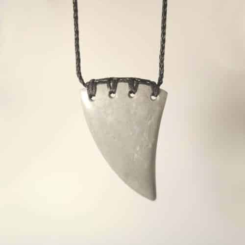This 65mm Niho is carved from Marutea Pakohe, shaped with a pronounced curve. The pale grey stone features soft flecks of white and a fine grain, suspended by a four-hole black ringbolt lashing. A taonga with flow and resilience.
