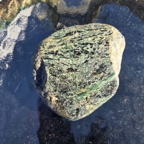This Pounamu cobble, 10cm across and 9cm deep, is polished on one side to reveal a striking mix of deep dark green with white flecks and bands of vivid gemmy green. The reverse keeps its natural skin, holding the energy of the river and whenua. A grounding stone to hold, reflect with, or keep close as a reminder of connection.