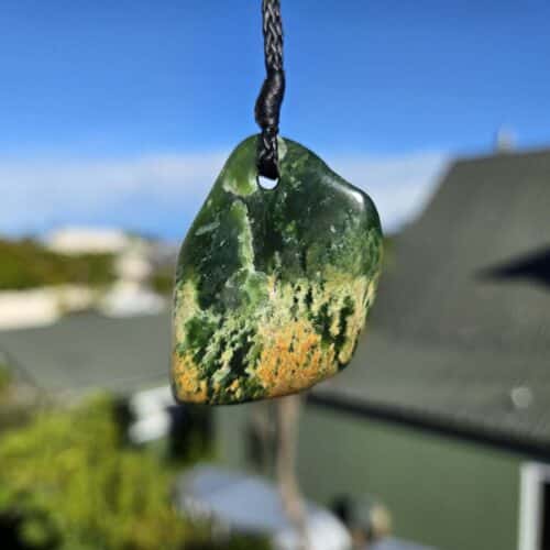 A freeform Flower Jade Pounamu taonga with vivid orange flower patterning and translucent apple green tones, finished simply on a black cord.
