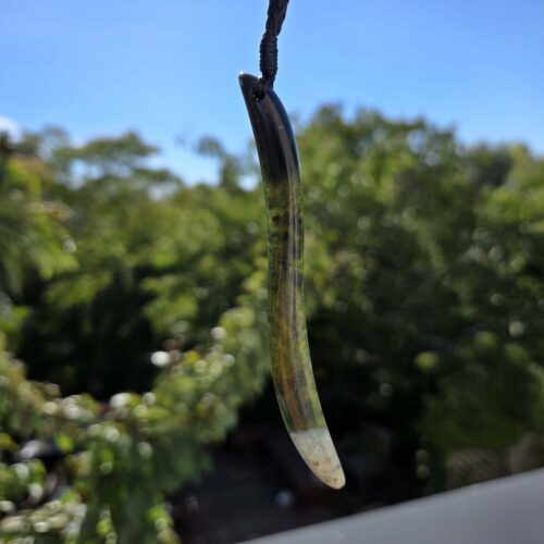 This 90mm Niho is carved from Marutea Pakohe, a dense, fine-grained stone with deep grey colouring and subtle variation. The shape symbolises protection, strength, and resilience — qualities reflected in the stone itself. Suspended by a five-hole ringbolt lashing in black, this is a bold taonga with presence and purpose.