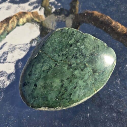 $315.00A Pounamu touchstone, 12cm wide, polished on one side with its natural skin left on the back. Found on the West Coast near Hokitika.