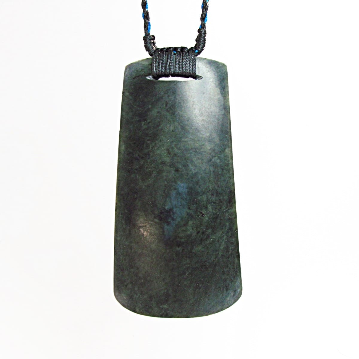 90mm Blue Eye Pounamu Toki from Takaka. Forest green stone with striking blue centre. Multi-plane waterfall design, bar lashing, and triangular toggle. Symbol of clarity and strength.