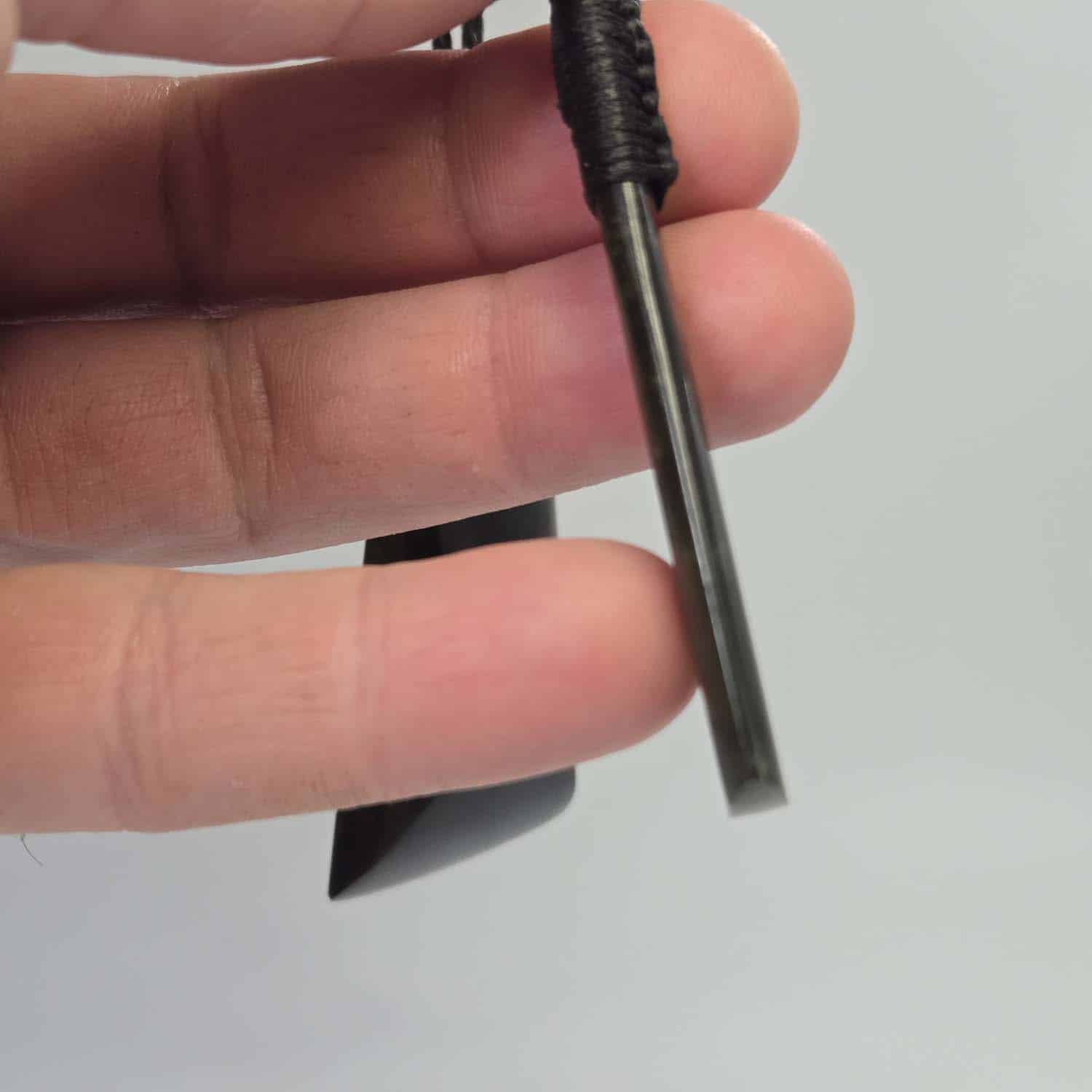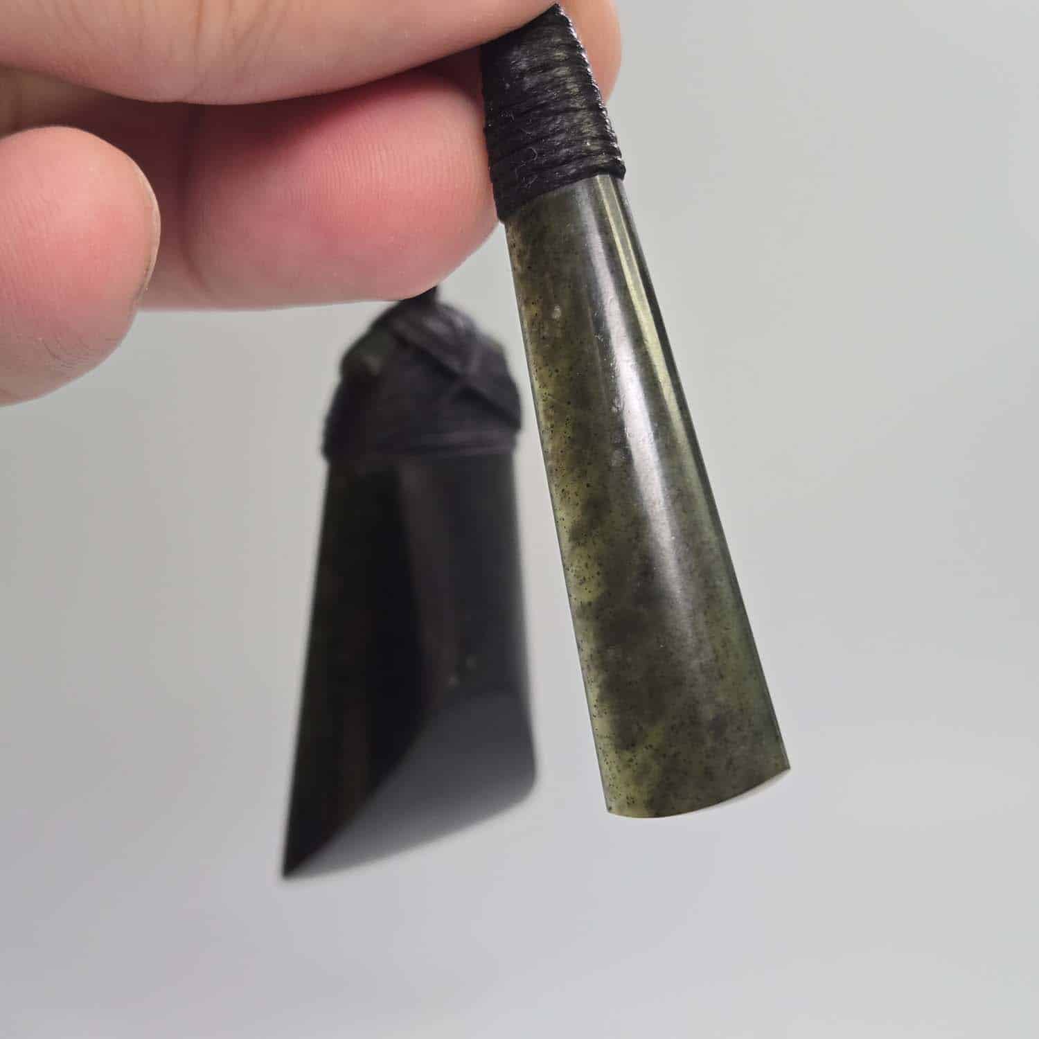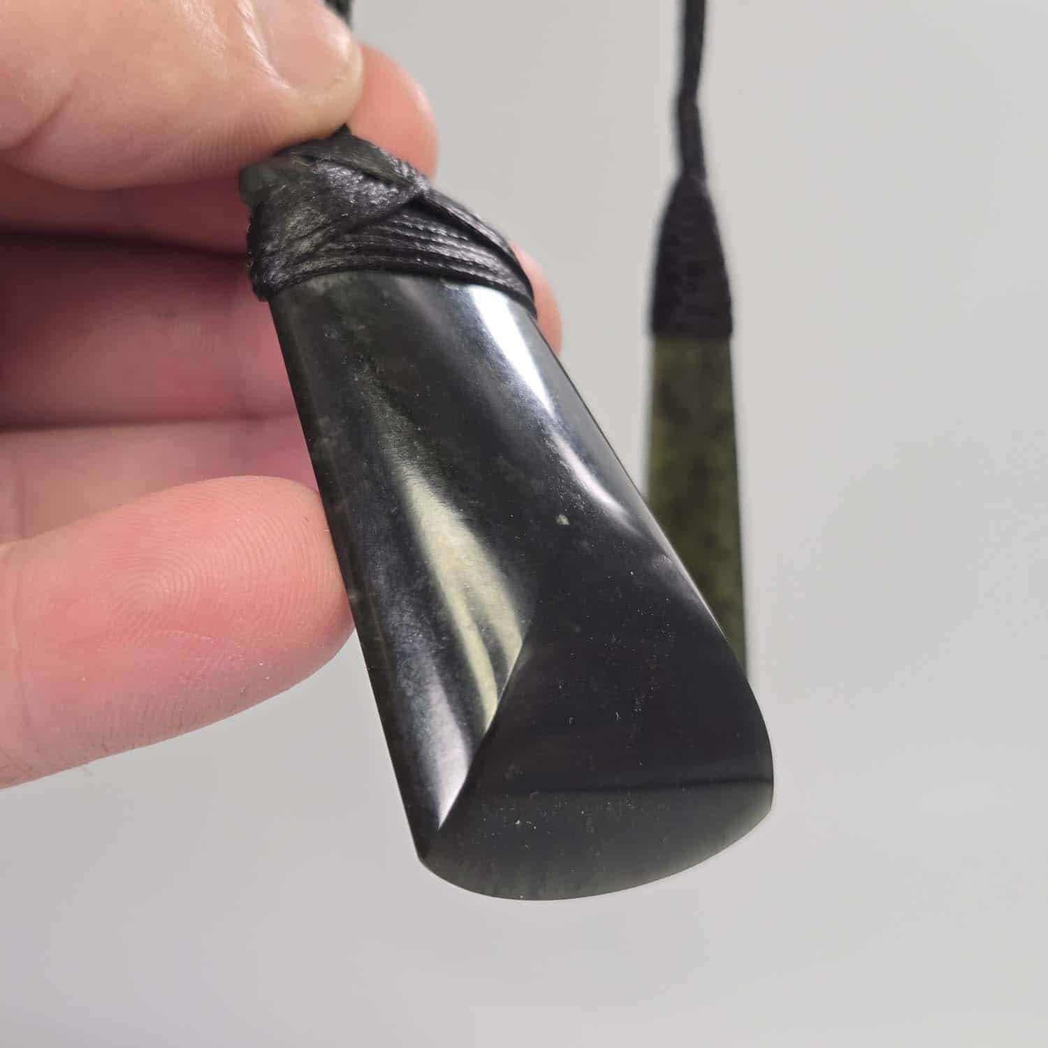 Each taonga measures 60mm long and is made from dark, forest green serpentine from the Nelson region. When held to the light, the stone glows with a rich translucency that brings its depth to life. Both are finished with black lashings and four-braid cords, ready to wear.