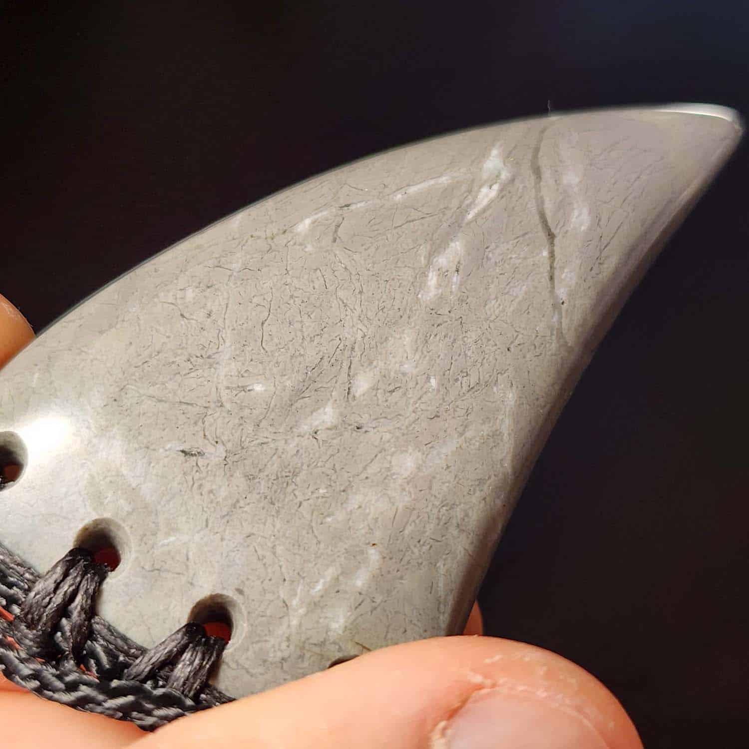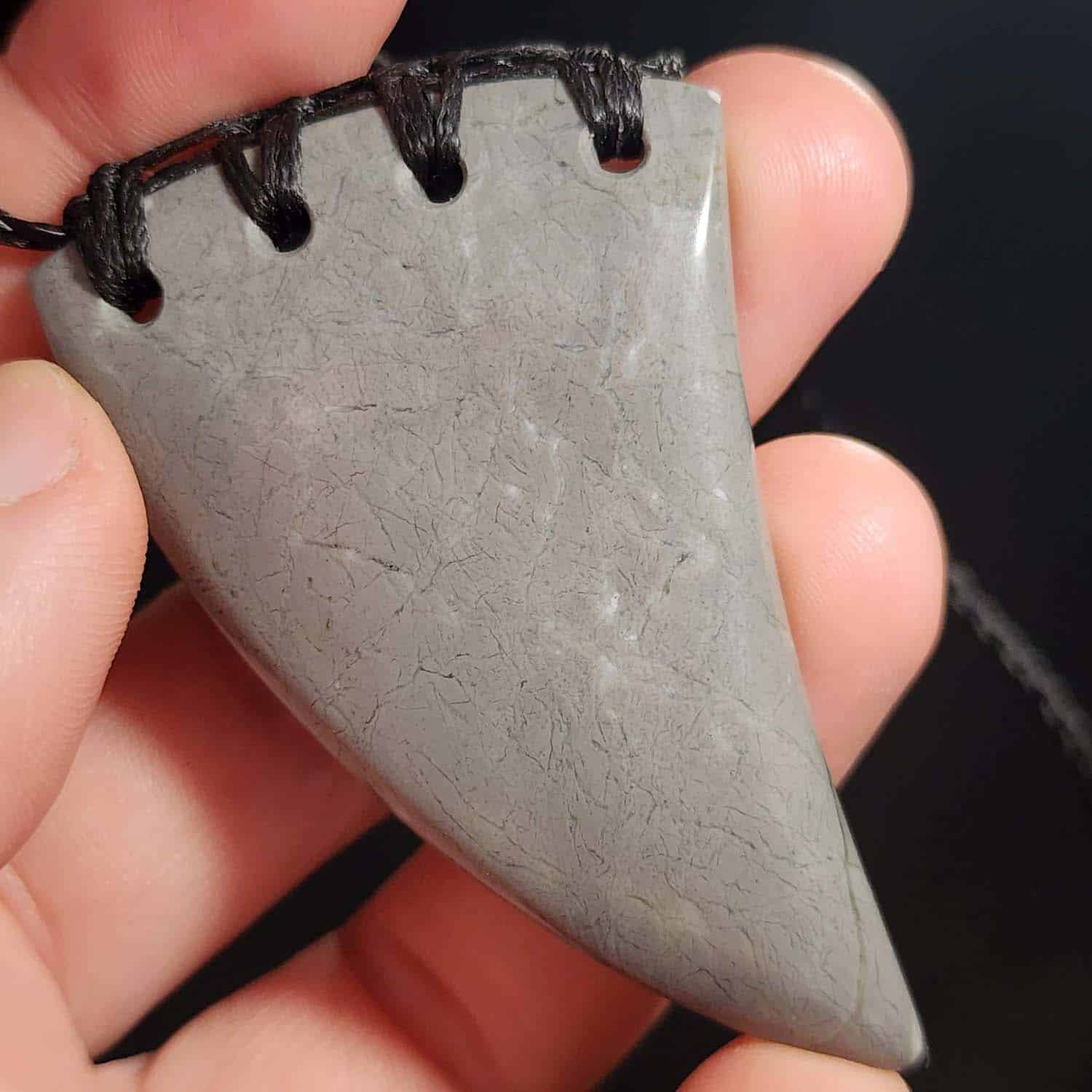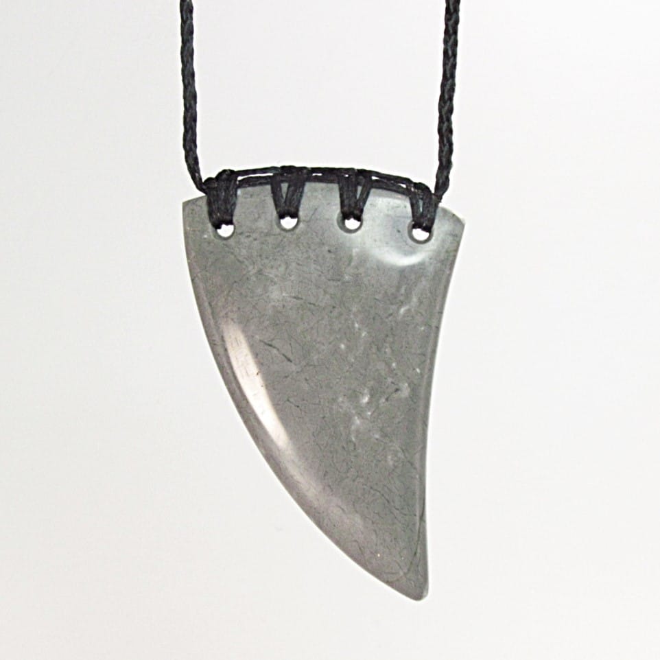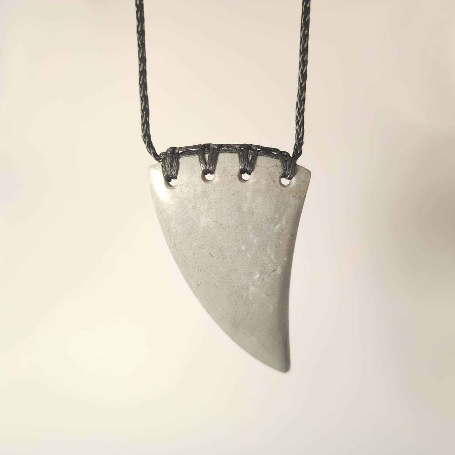 This 65mm Niho is carved from light grey Marutea Pakohe — a dense, fine-grained stone with soft white flecks that add subtle character and variation. This version leans into the natural curve of a tooth shape, giving it a more organic and flowing feel.