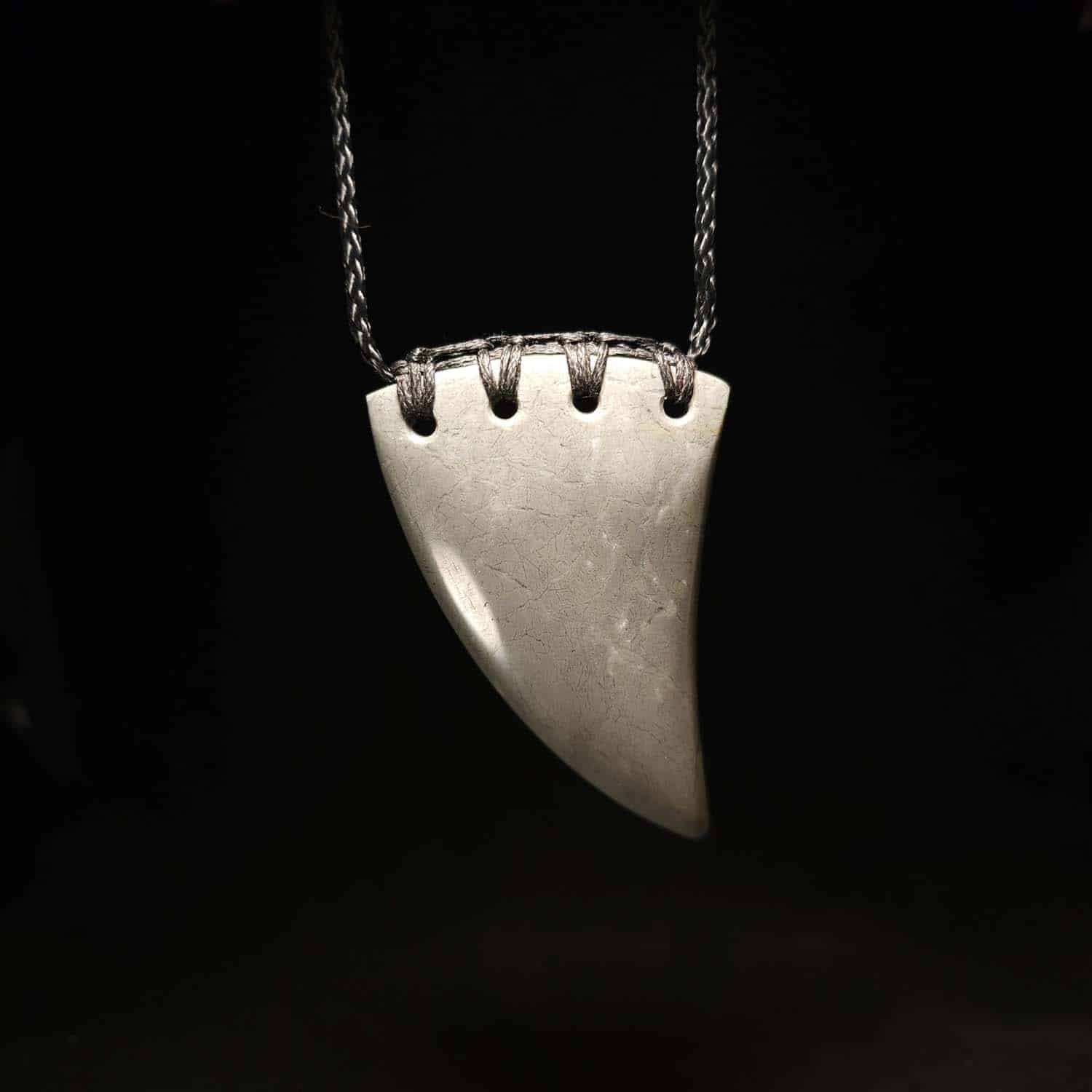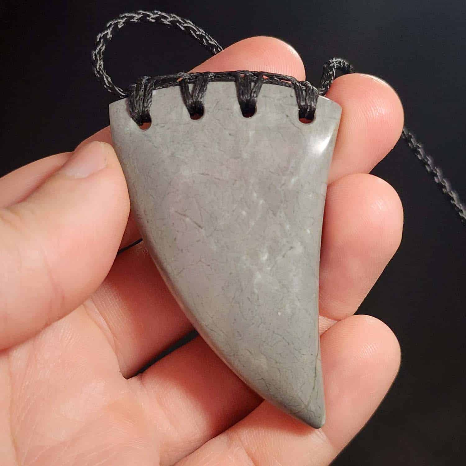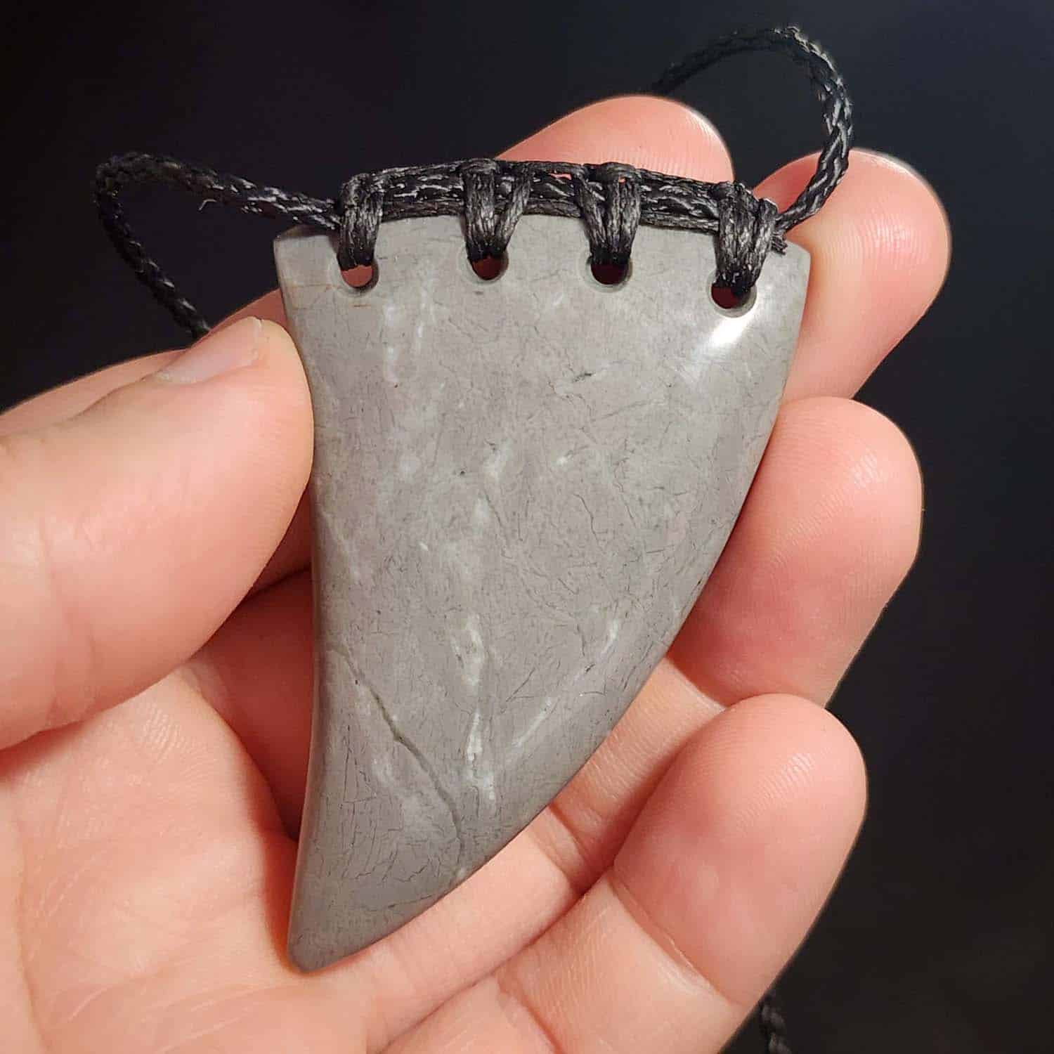 This 65mm Niho is carved from light grey Marutea Pakohe — a dense, fine-grained stone with soft white flecks that add subtle character and variation. This version leans into the natural curve of a tooth shape, giving it a more organic and flowing feel.