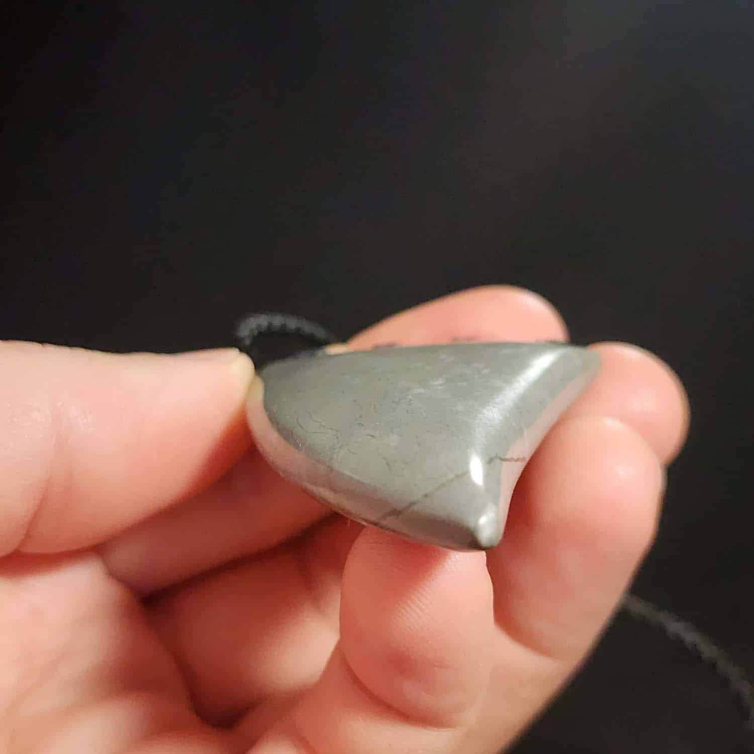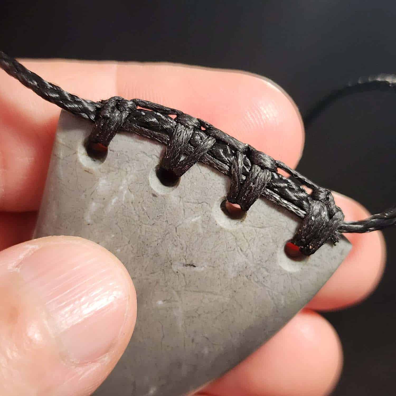 Suspended with a four-hole ringbolt lashing in black cord, the pendant sits comfortably and securely, highlighting both the curve of the stone and the integrity of its shape.