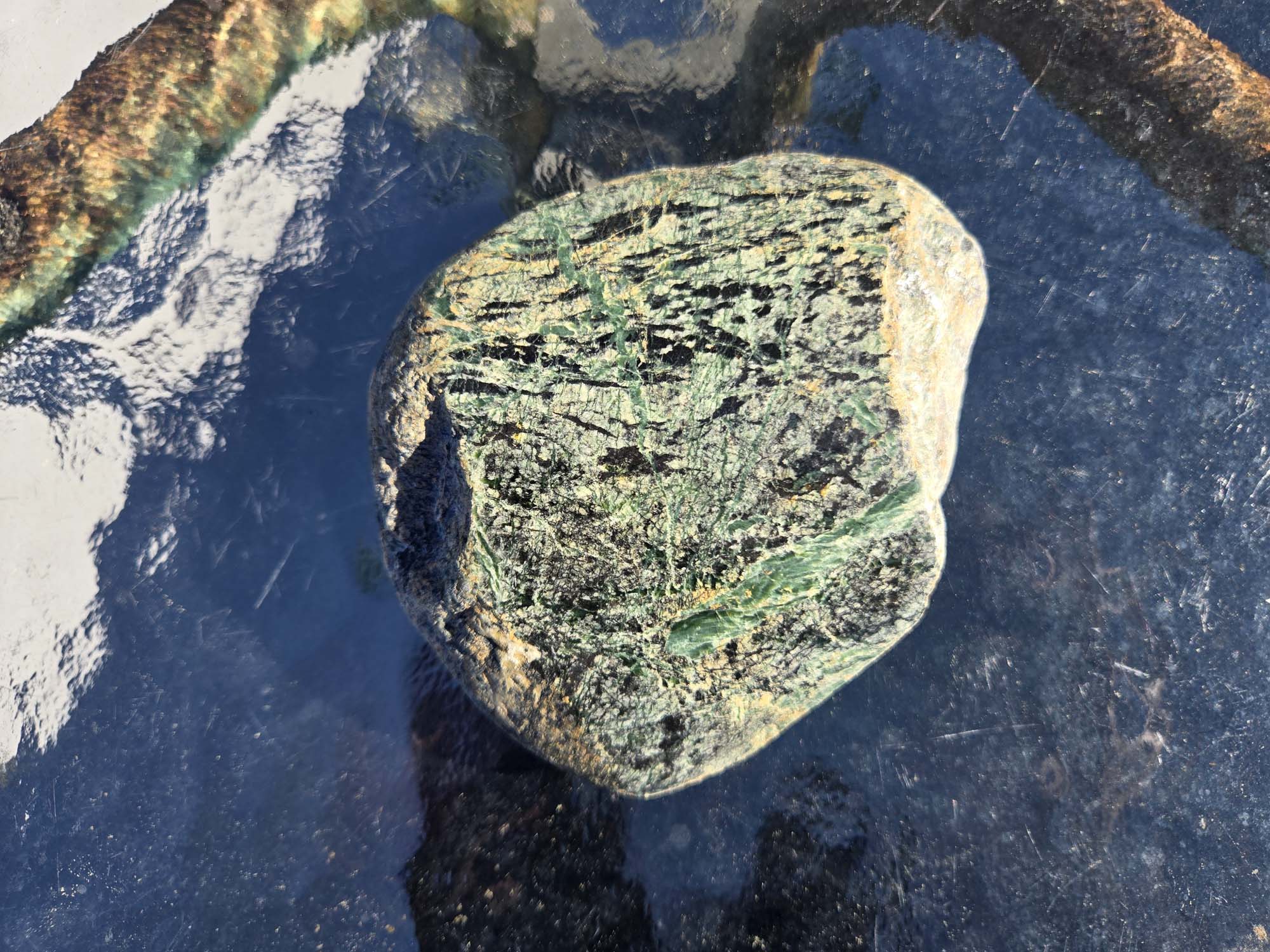 This Pounamu cobble, 10cm across and 9cm deep, is polished on one side to reveal a striking mix of deep dark green with white flecks and bands of vivid gemmy green. The reverse keeps its natural skin, holding the energy of the river and whenua. A grounding stone to hold, reflect with, or keep close as a reminder of connection.