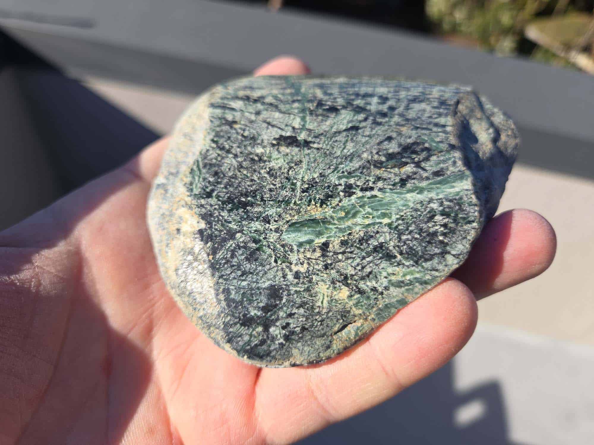 This serpentine Pounamu cobble has been carefully polished on one side, revealing a dramatic play of colour and texture. The stone measures 10cm across, 9cm deep, and around 2cm thick — a comfortable size to rest in the hand, or to place somewhere meaningful in your home or workspace.