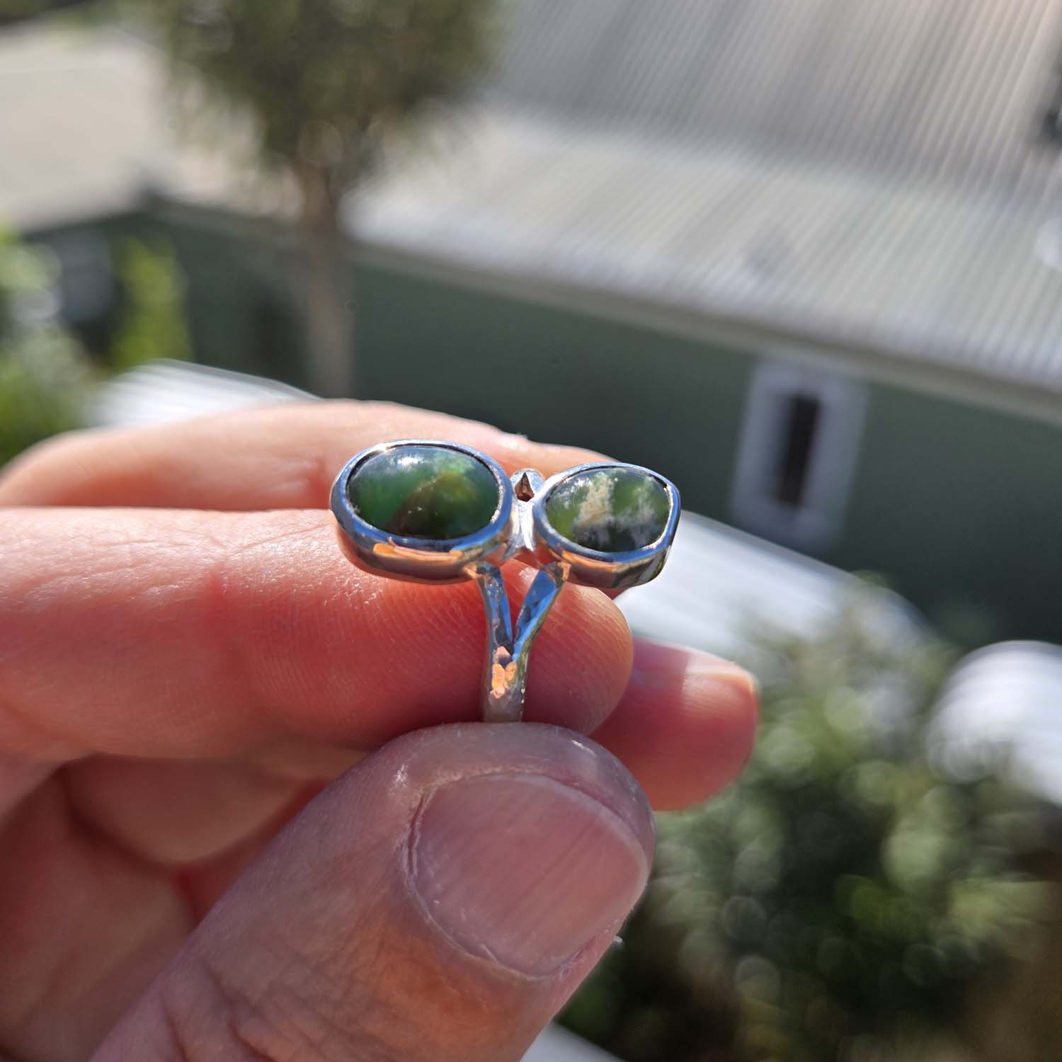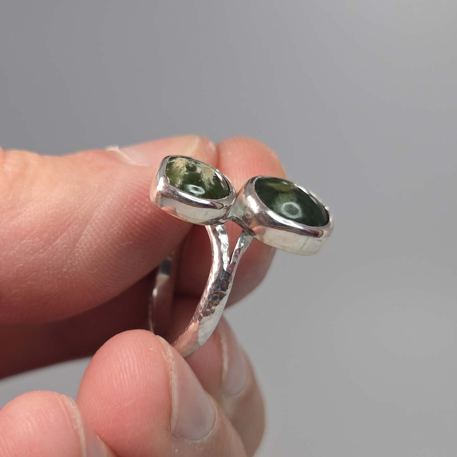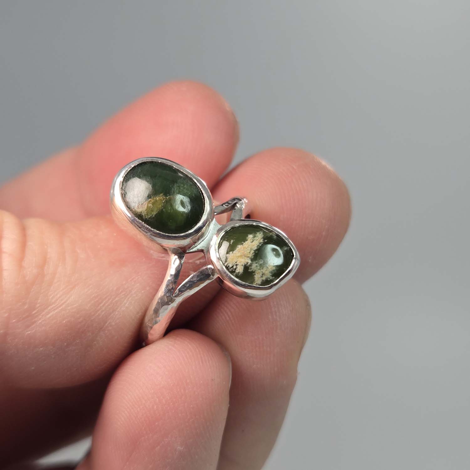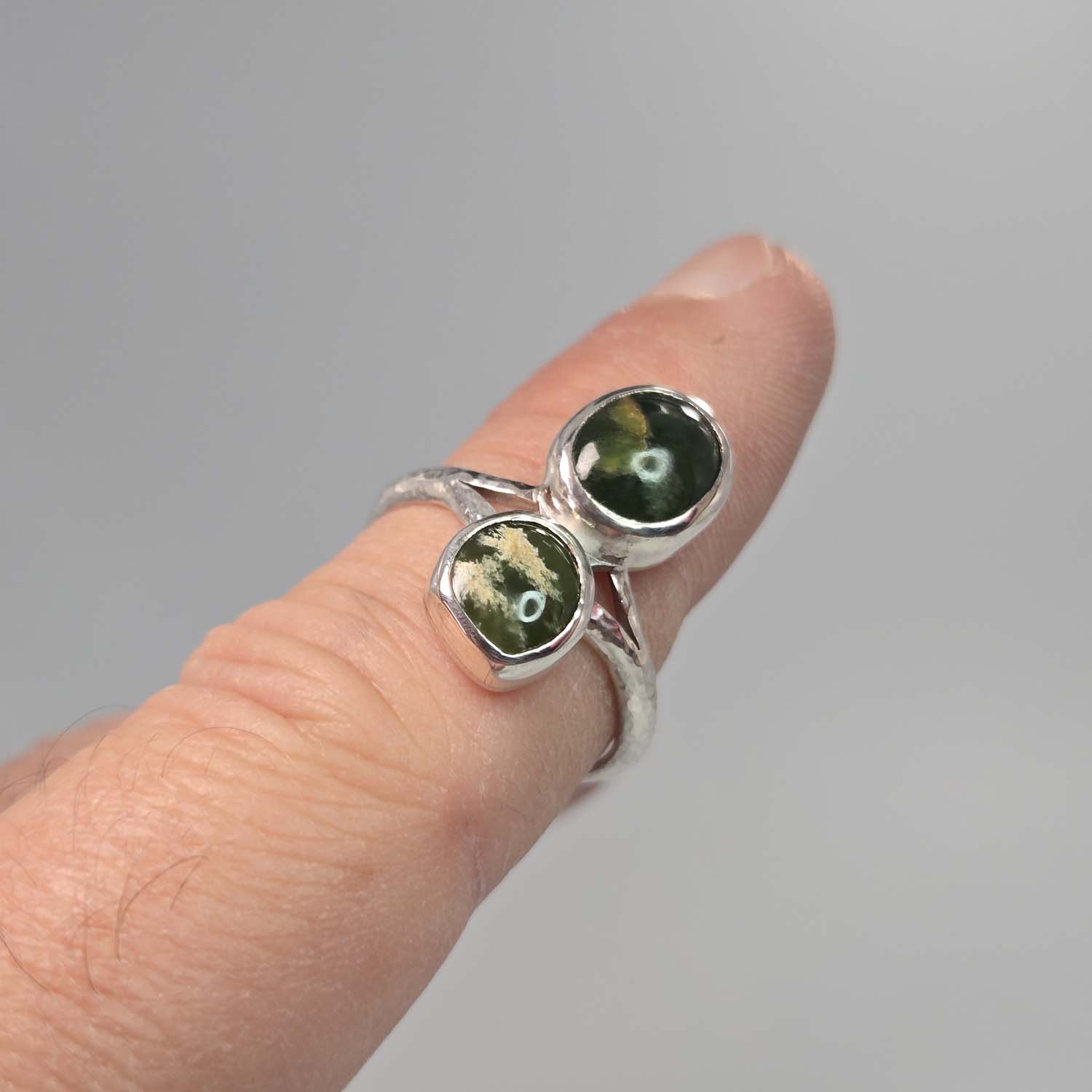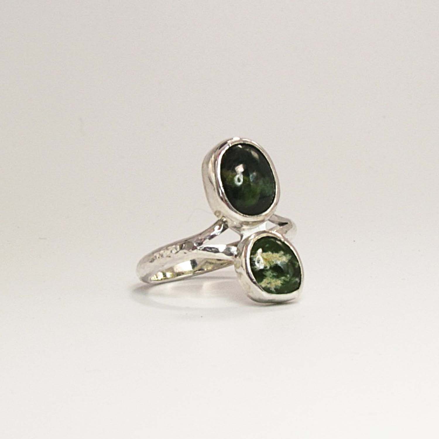 This sterling silver ring features two oval Flower Jade Pounamu cabochons set side by side on a hammered silver band. One stone is classic dark Marsden Flower Jade, the other a brighter apple green variety. A simple band with strong contrast and natural character.