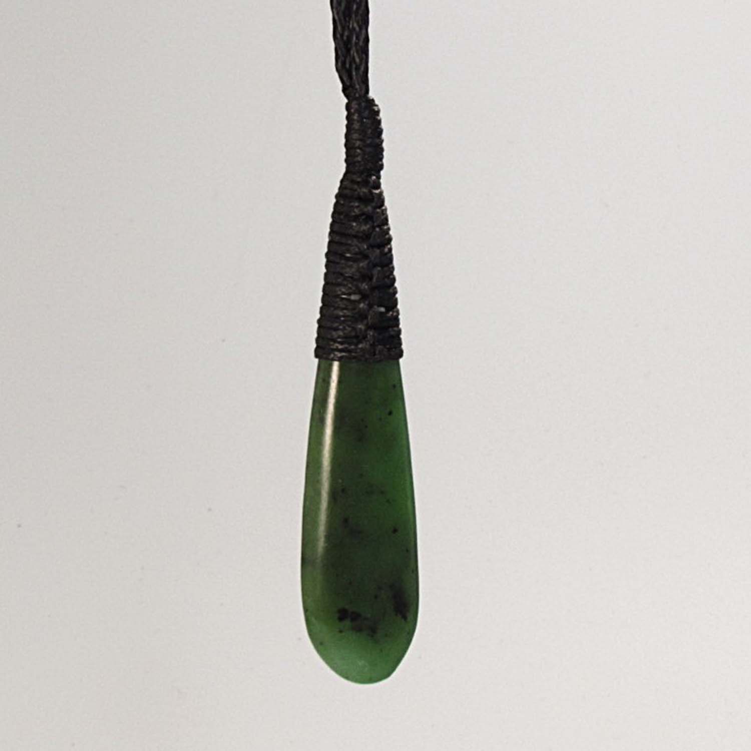The taonga is finished with a traditional black roimata lashing that sits cleanly at the top of the carving and contrasts strongly with the bright green stone.