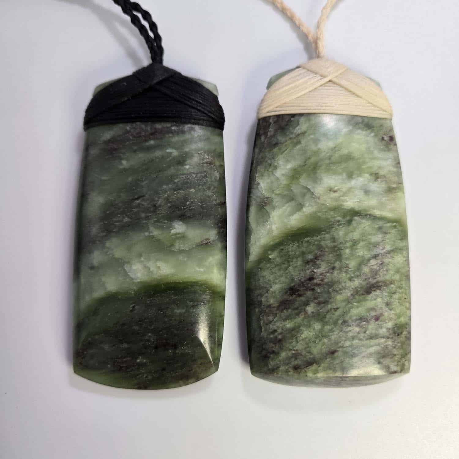 These two Pounamu taonga were created as part of an exploration into the effects of heat treatment on Pounamu during the Inside Pounamu wānanga at Otago University. Both come from the same slab of South Westland stone — one half left in its natural form, the other carefully heat-treated. The natural piece, finished with a black lashing, keeps its rich green depth and translucency. The heat-treated piece, finished with white lashing, has lightened in tone and carries the memory of the process that changed it.
