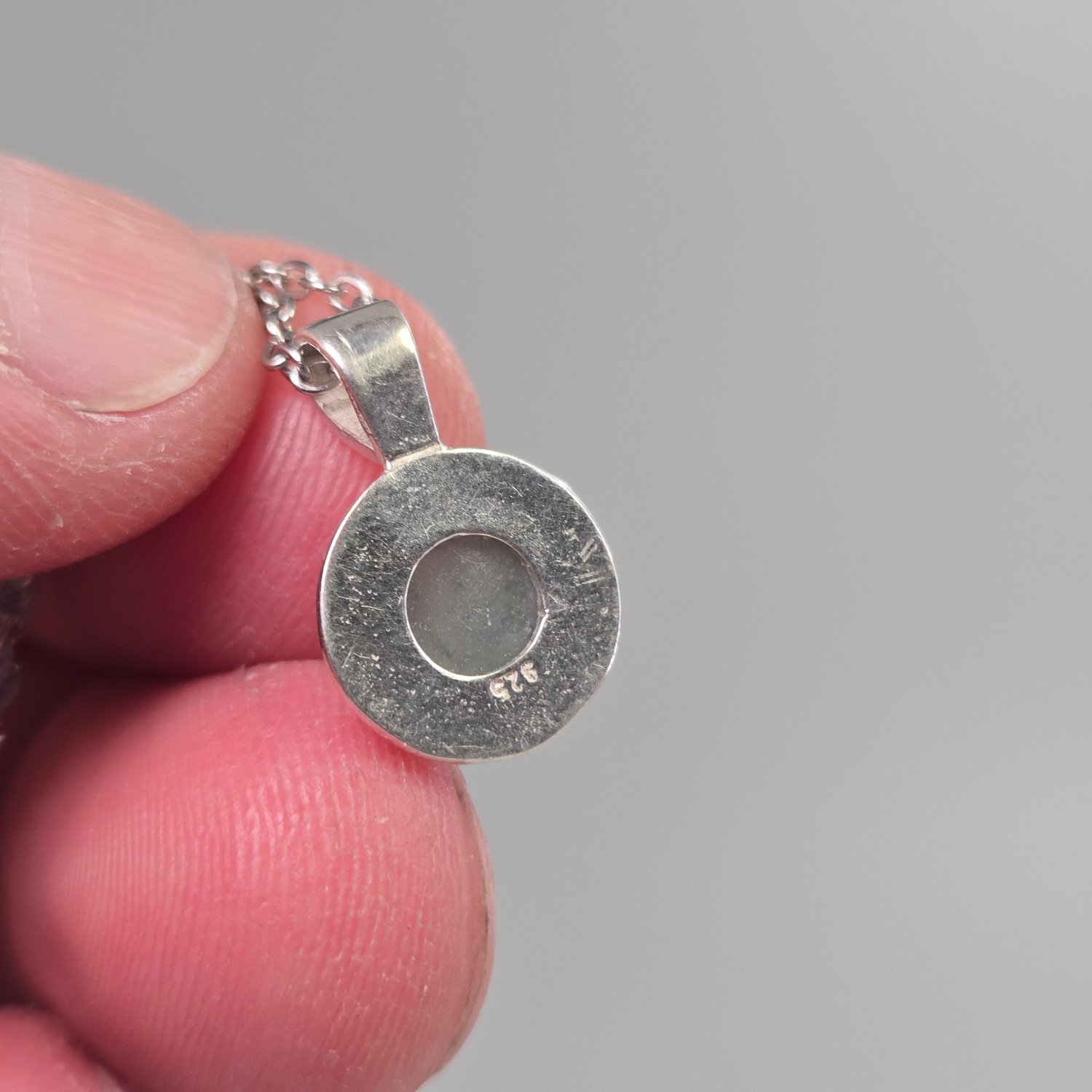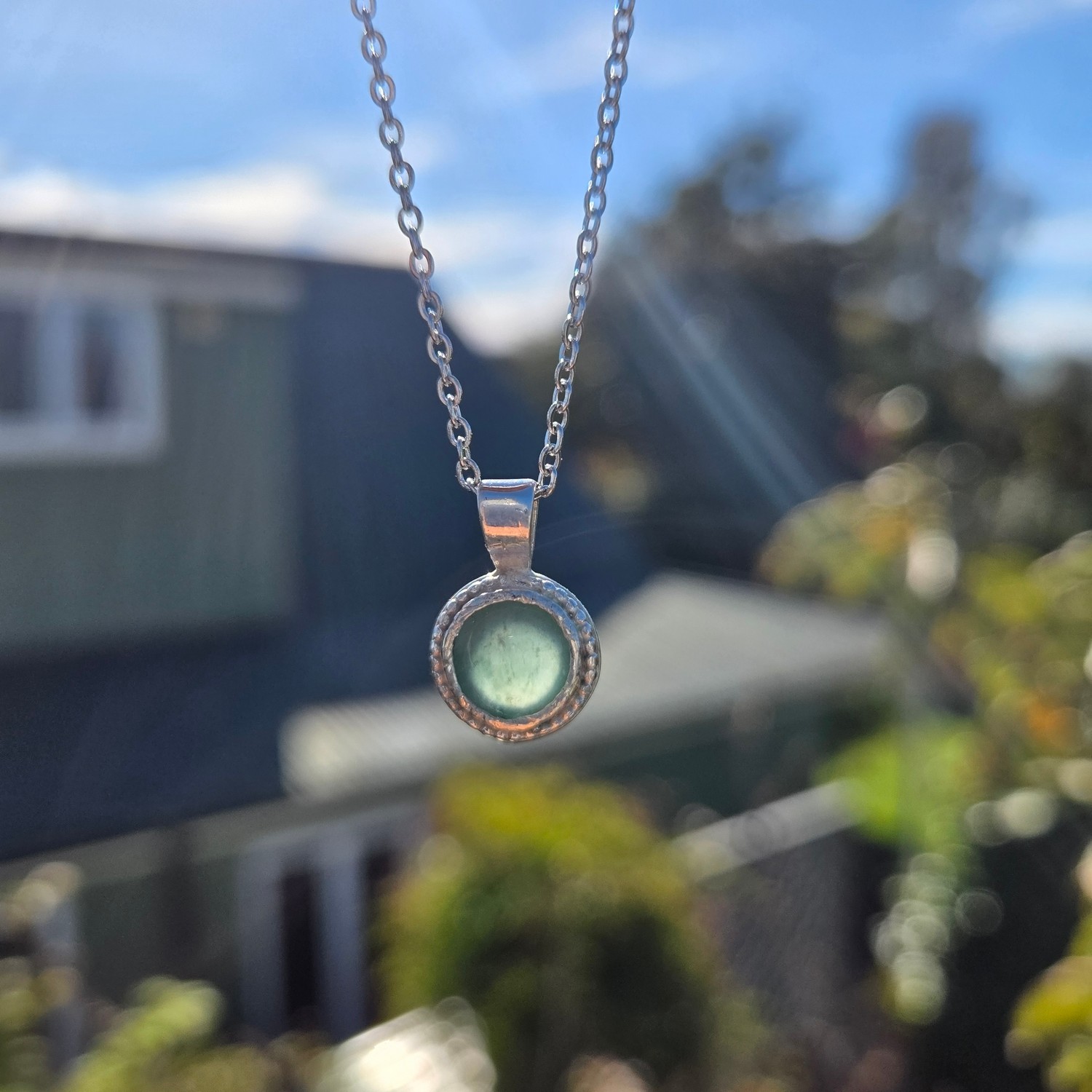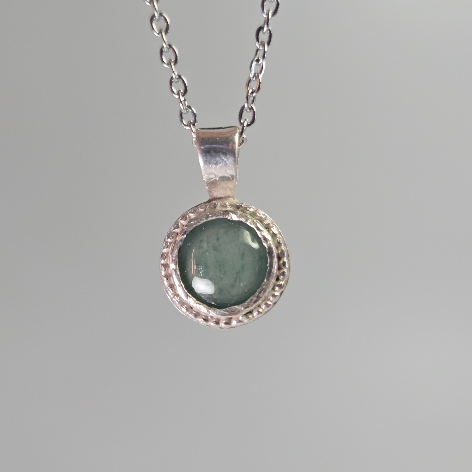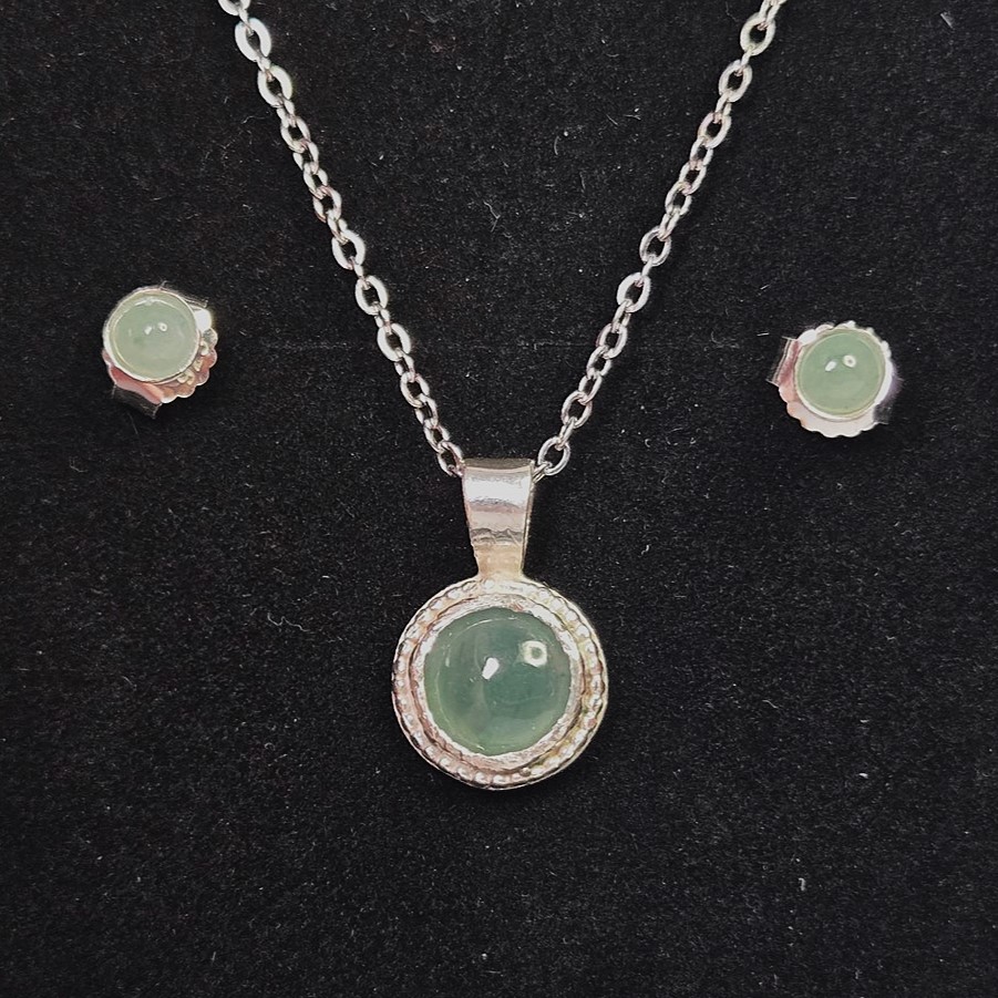 The pendant features a 7mm domed circular cabochon set in sterling silver. The setting is open at the back, allowing light to pass through the stone so its internal clarity can be seen when worn. This design choice brings the jadeite to life, especially in natural light. The earrings are 4mm circular studs, also set in sterling silver, keeping the design simple and cohesive with the pendant.