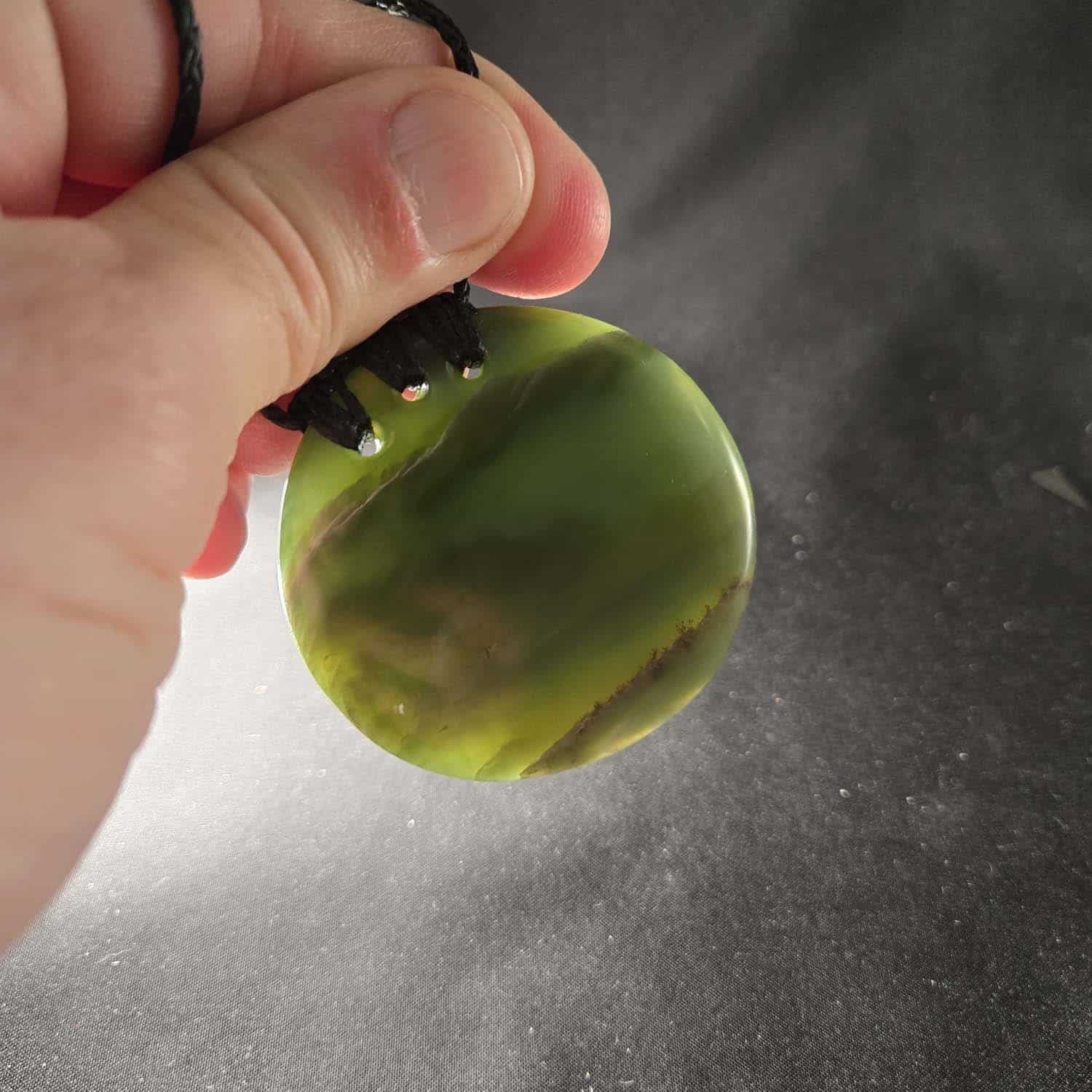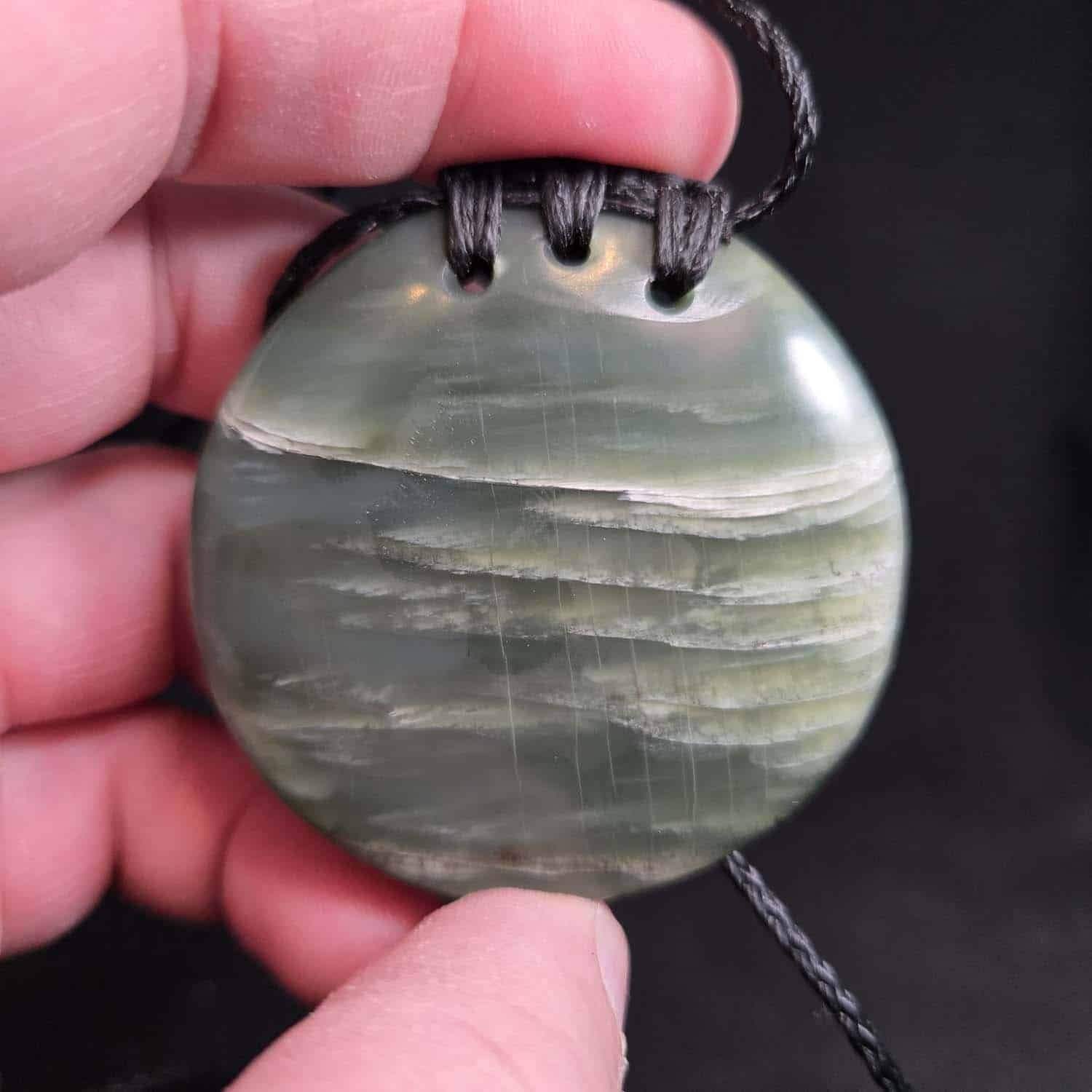 This 53mm porohita is carved from beautiful Inanga Pounamu with soft, glassy greens and pale creamy tones. Subtle linear inclusions run across the face of the stone, giving it character and flow. It has a stunning glow when it catches the light, and it’s suspended by a black 3-hole ringbolt lashing