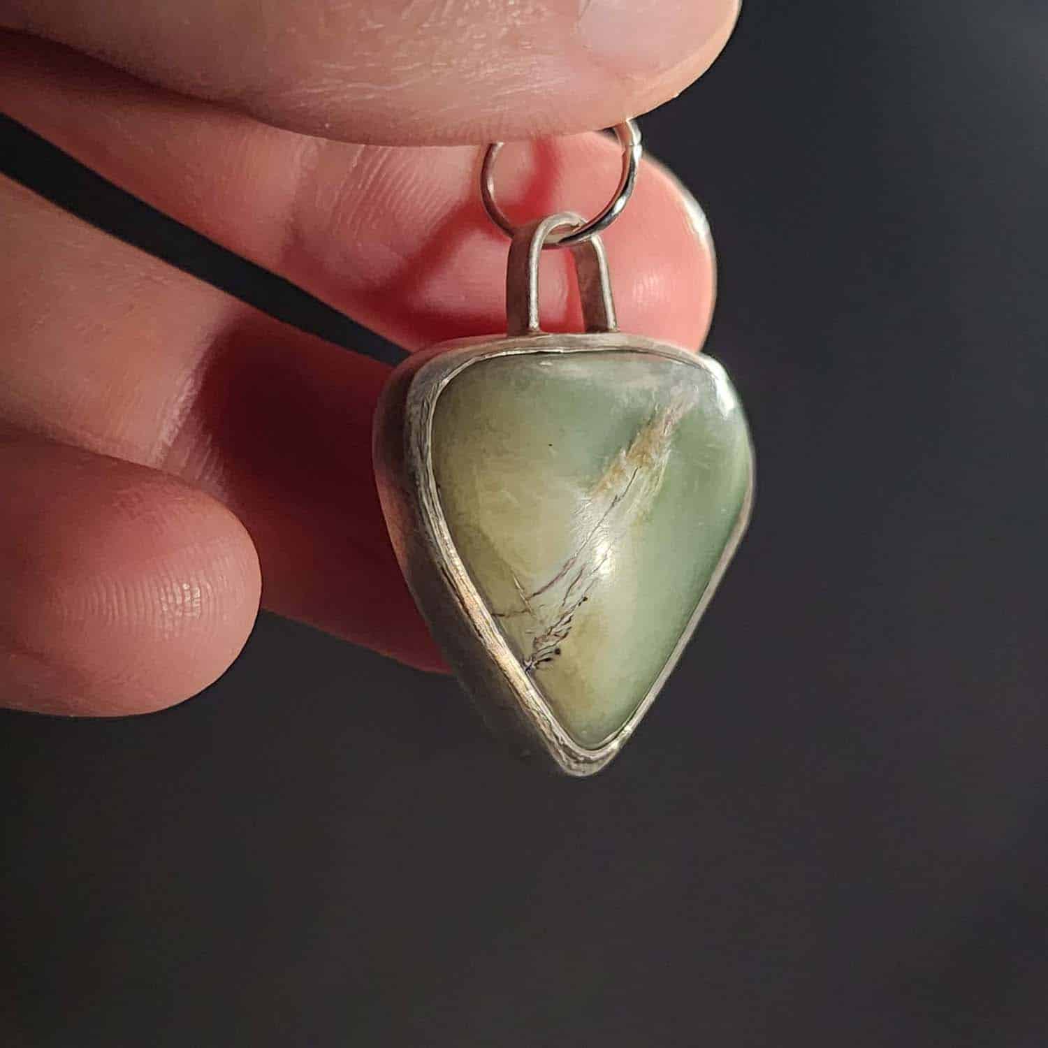 This Inanga Pounamu Tapatoru pendant is a collaboration between myself and M.V.H Jewellers. I carved the triangular form from a soft-toned piece of Inanga Pounamu that also shows subtle Raukāraka colouring. A naturally banded flaw runs across the centre of the stone — not something to hide, but something that draws the eye and tells the story of the stone’s formation.