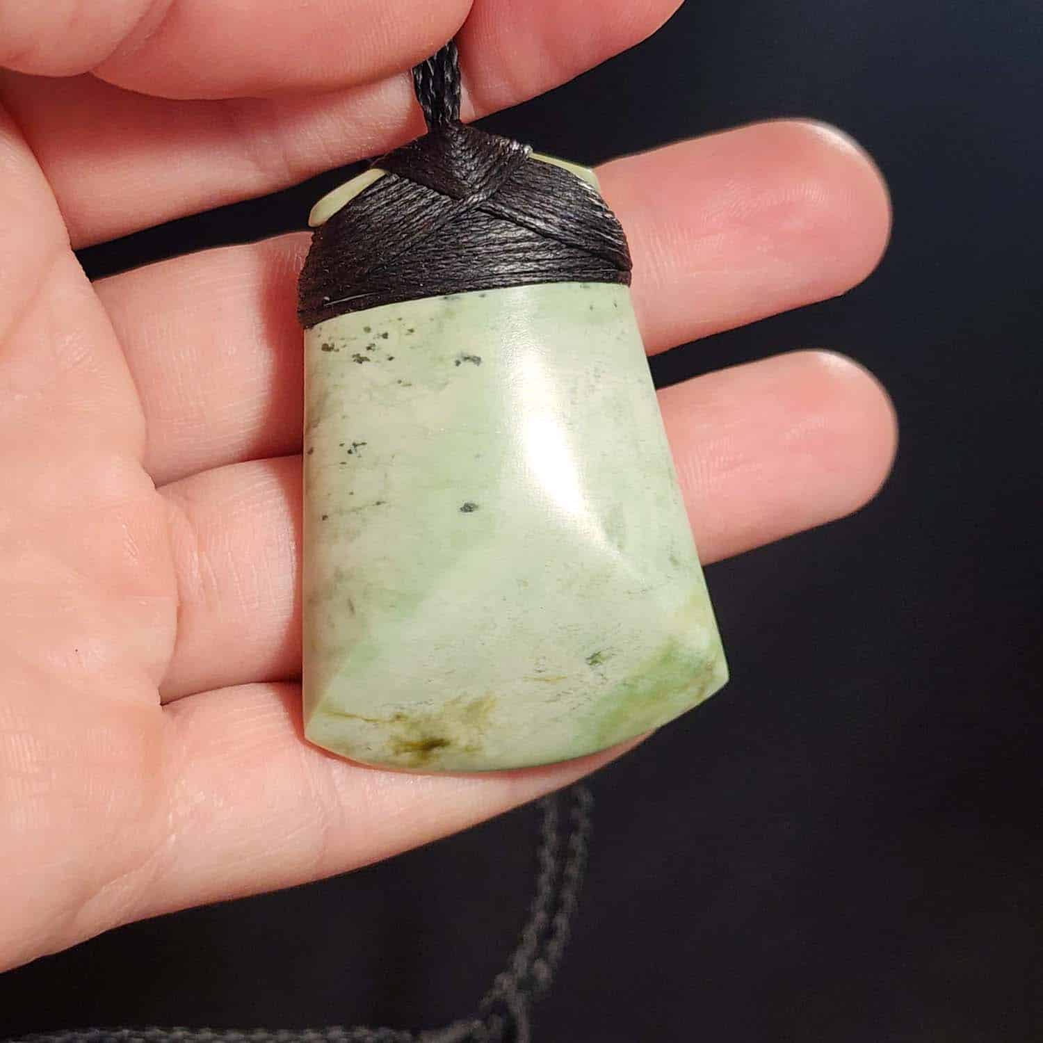 This 55mm Toki is carved from pale green Inanga Pounamu, with soft tones that glow gently in the light. Its classic form is paired with a bold black lashing for contrast. A clean, simple taonga with timeless presence.