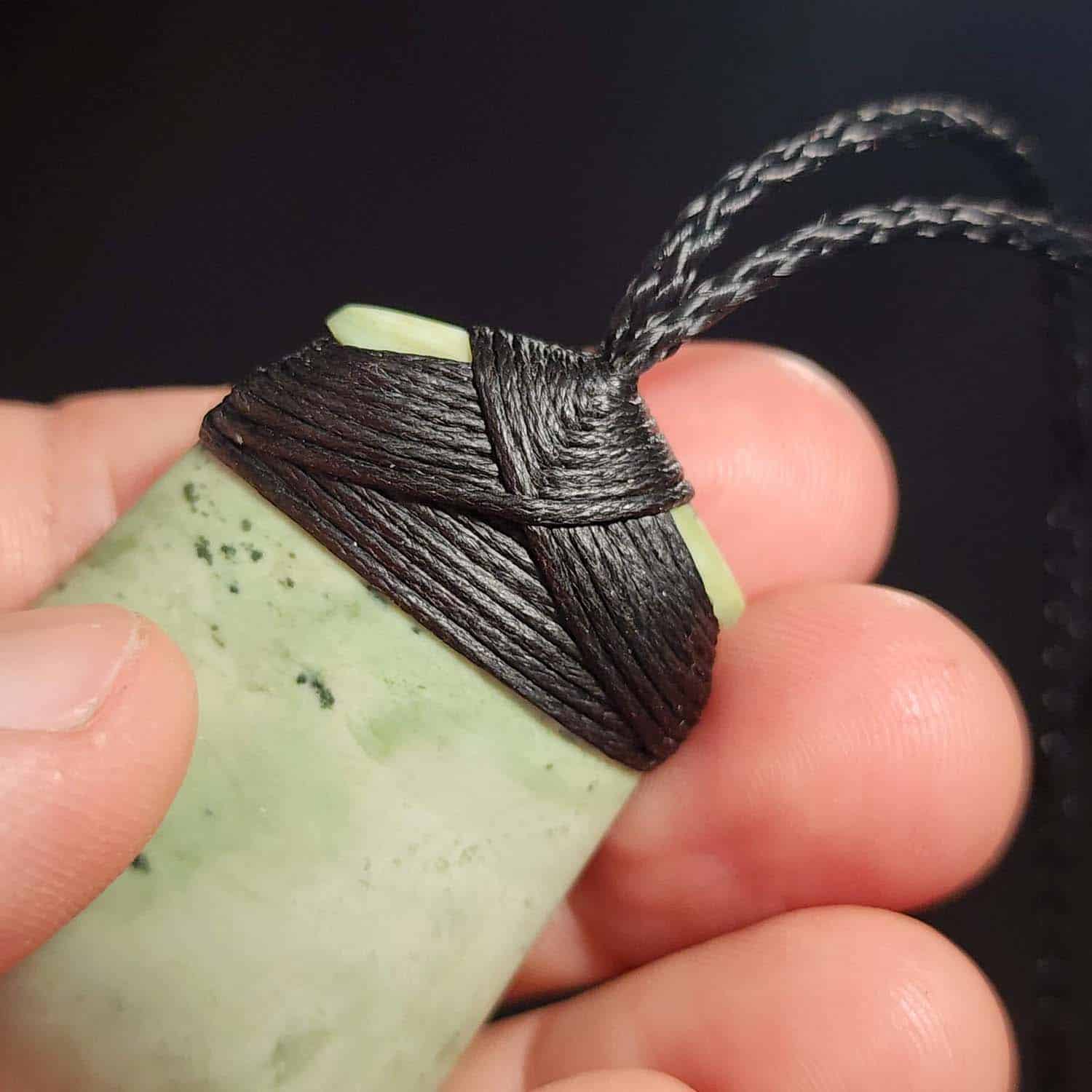 A deep black lashing adds a striking contrast, drawing the eye to the subtle colouring of the Pounamu. It comes ready to wear, strung on a hand-braided adjustable cord. A simple and elegant piece for someone who values subtlety and quiet power.