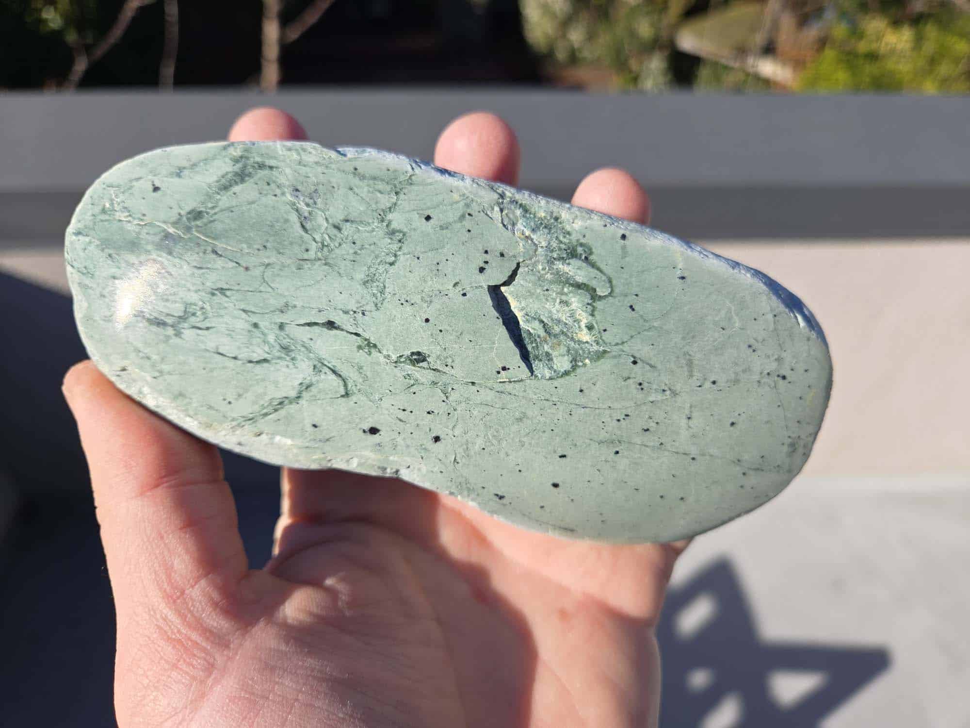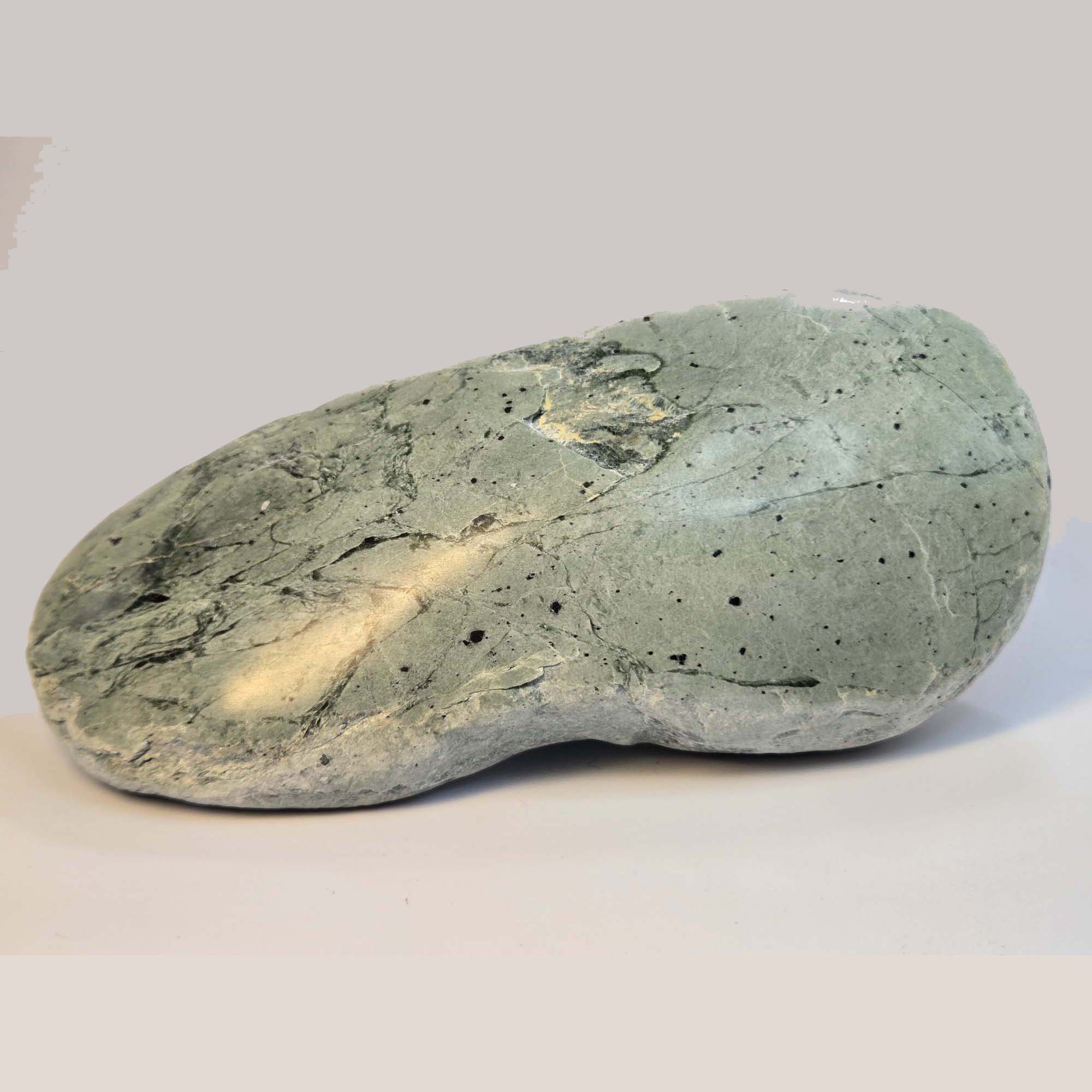 This touchstone is made from Serpentine Pounamu, a stone recognised for its gentle pale green hues and grounding energy. At 14cm long, 6cm deep, and 3cm high, it is a substantial piece that fits comfortably in the hand. Its colouring is mostly soft pale green, highlighted by darker spots and natural swirls that give the stone its unique character.