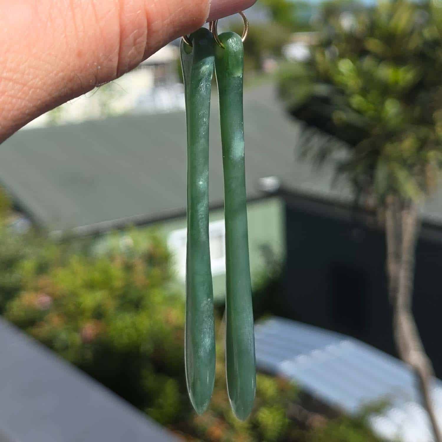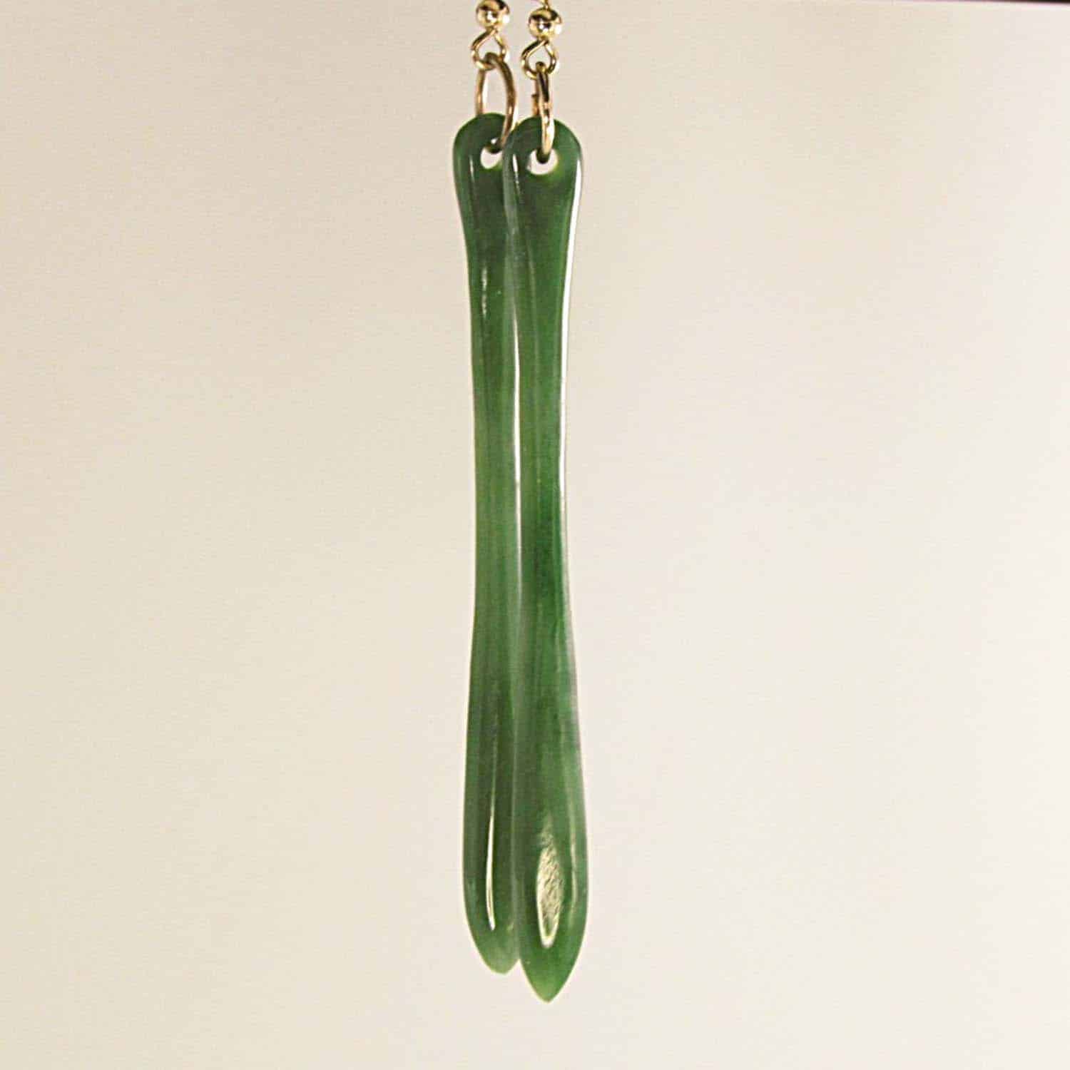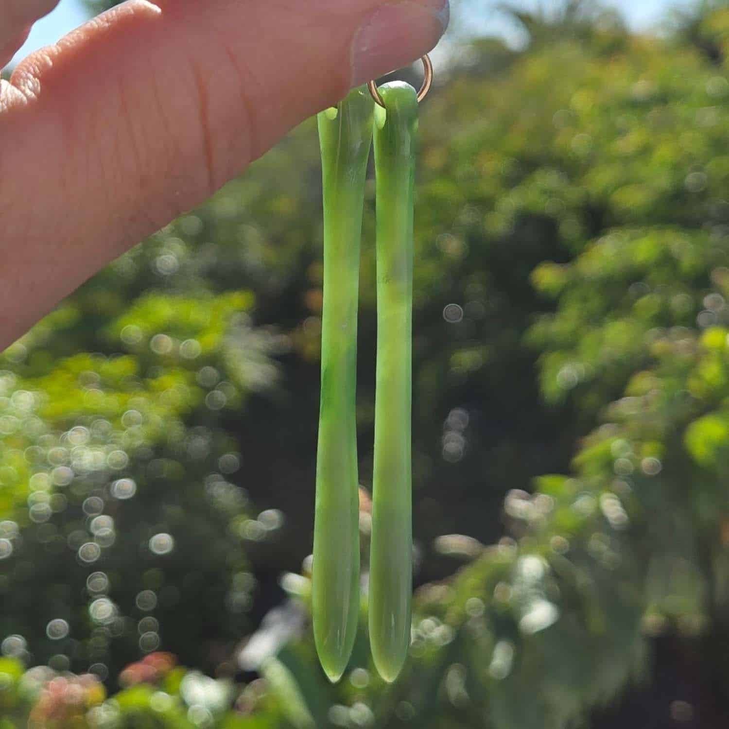The inanga Pounamu used for this pair is a pale, soft green with beautiful translucency. Held to the light, the stone glows, showing the gentle tones and natural character of inanga. Each earring is about 80mm long and finished with 14kt gold plated sterling silver hoops and hooks.