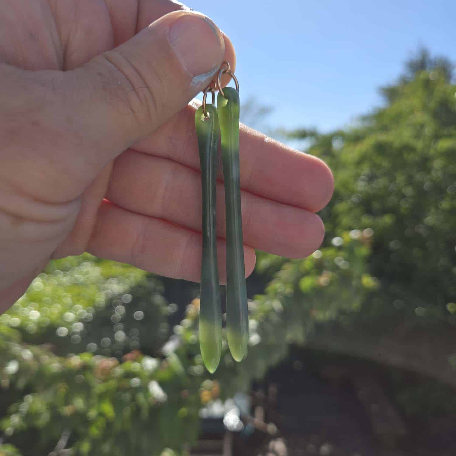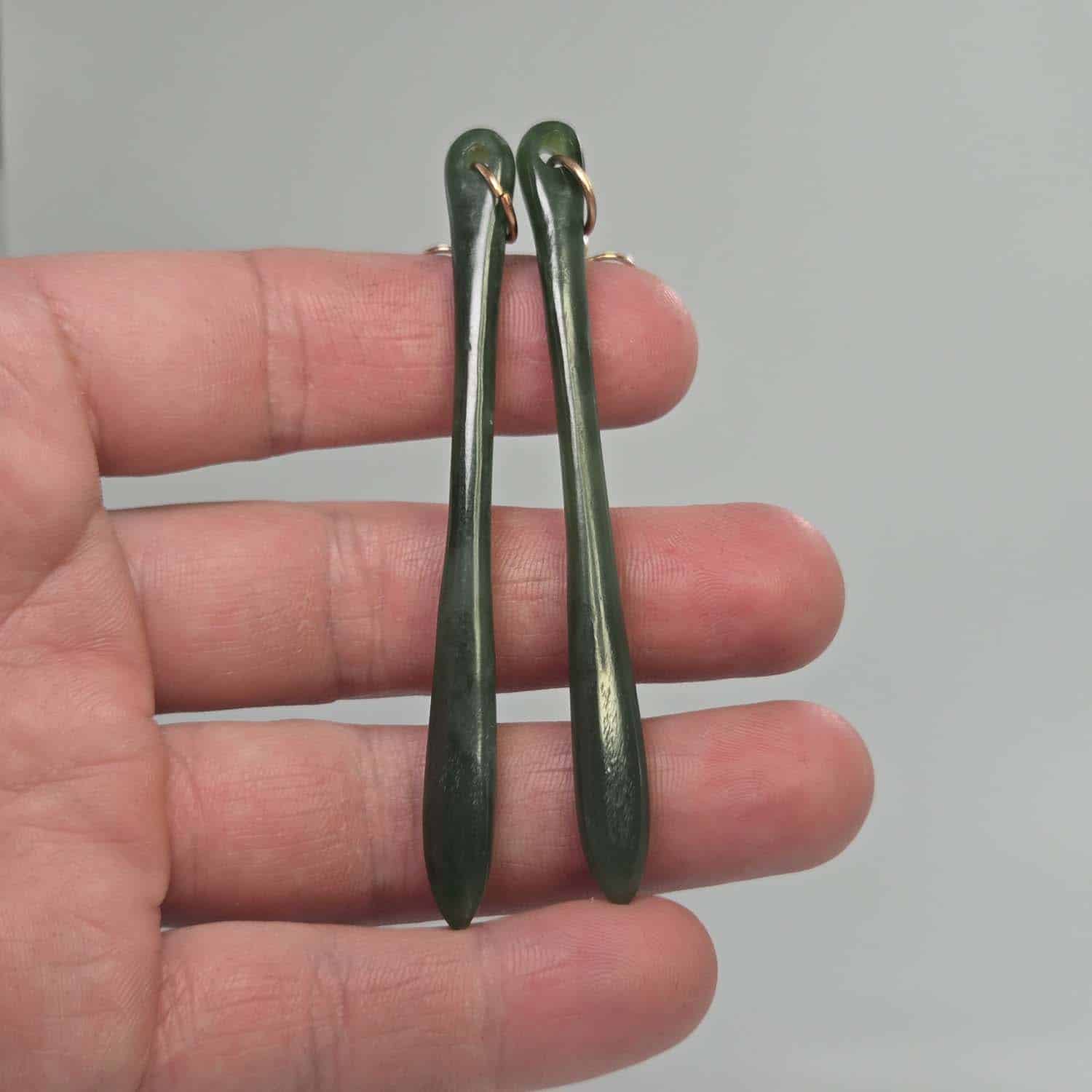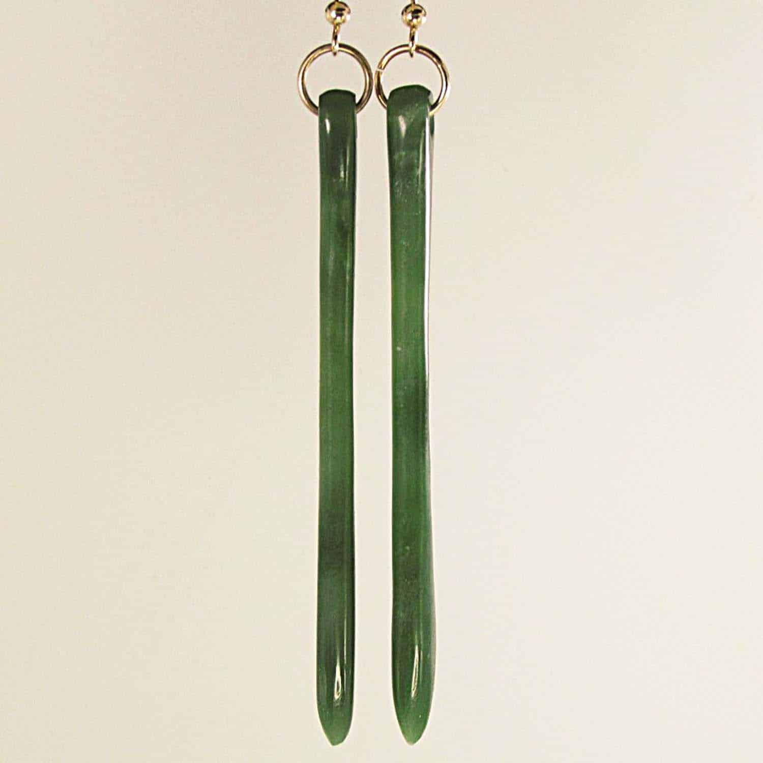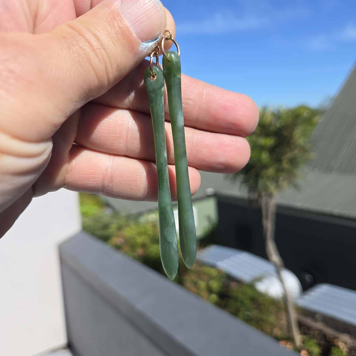 The inanga Pounamu used for this pair is a pale, soft green with beautiful translucency. Held to the light, the stone glows, showing the gentle tones and natural character of inanga. Each earring is about 80mm long and finished with 14kt gold plated sterling silver hoops and hooks.