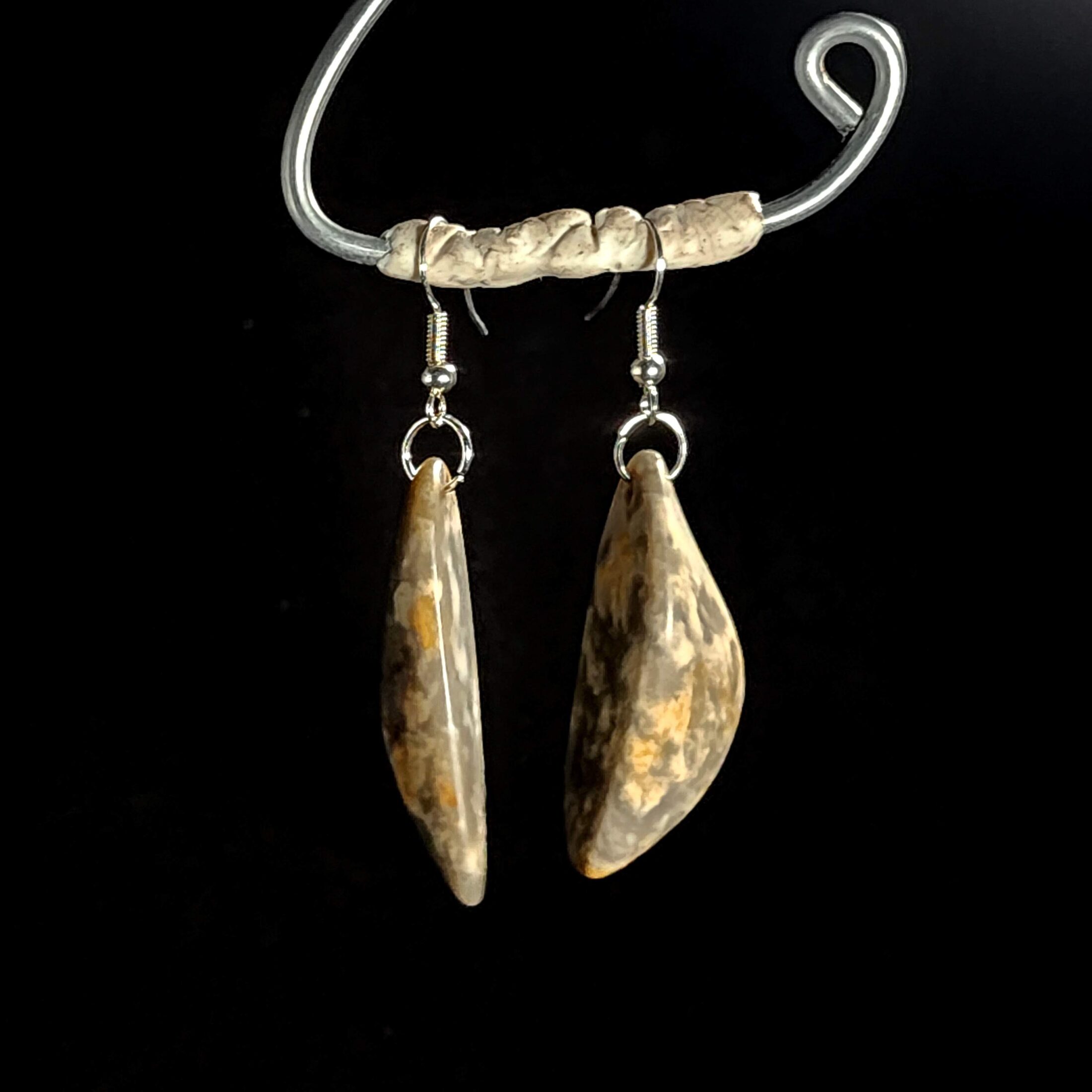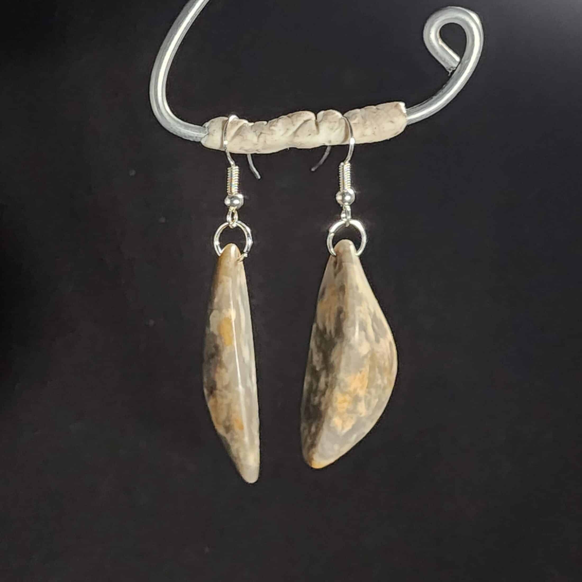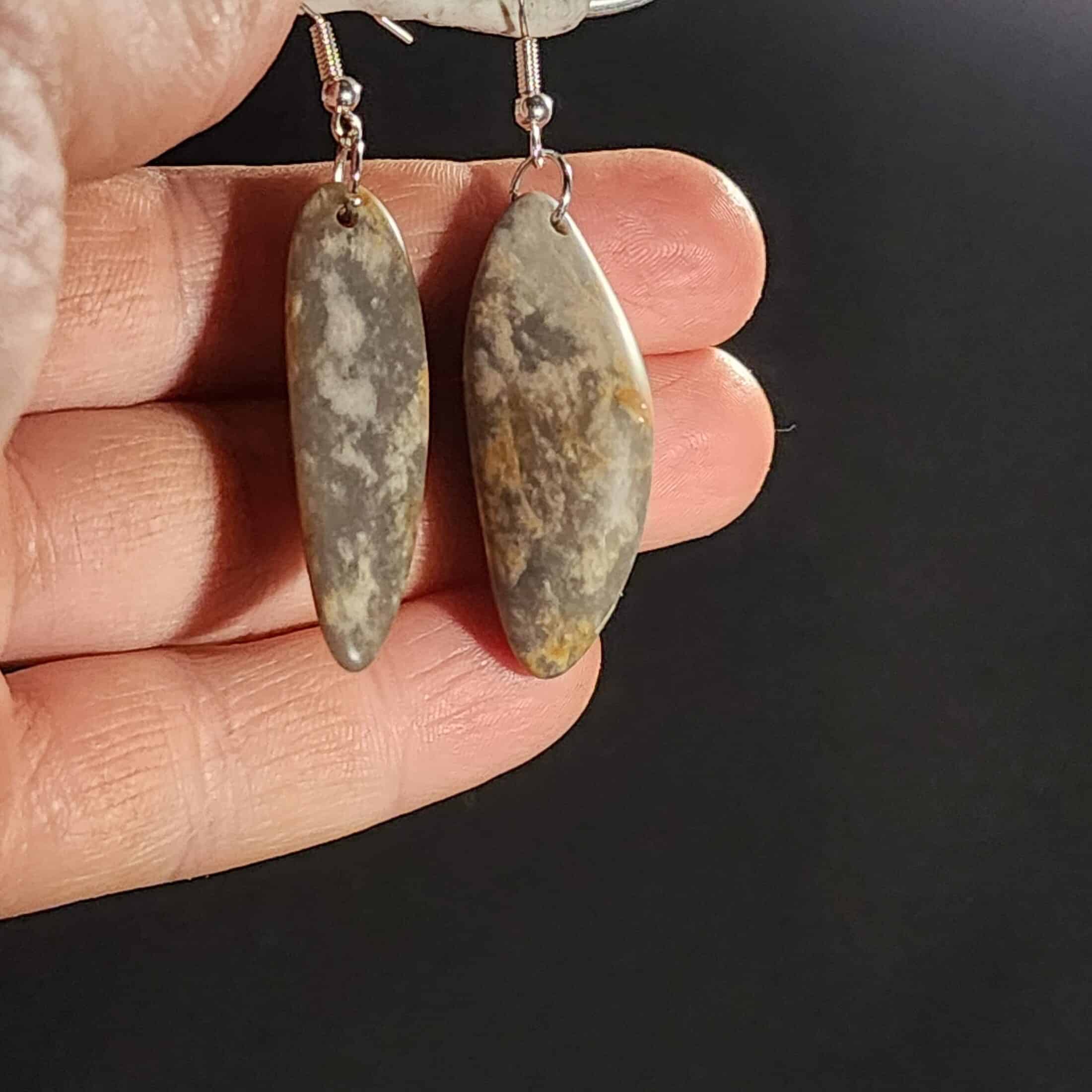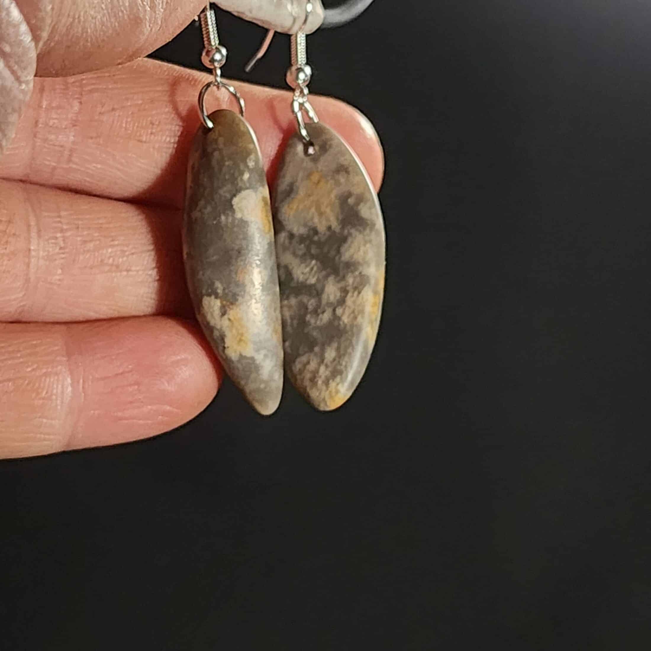 A one-off pair of earrings made from Kaitorete Spit quartzite, featuring white flowering patterns in purple-grey stone. 40mm long with flat and curved sides. This taonga holds the memory of a place where land meets sea, offering a quiet sense of balance and connection.