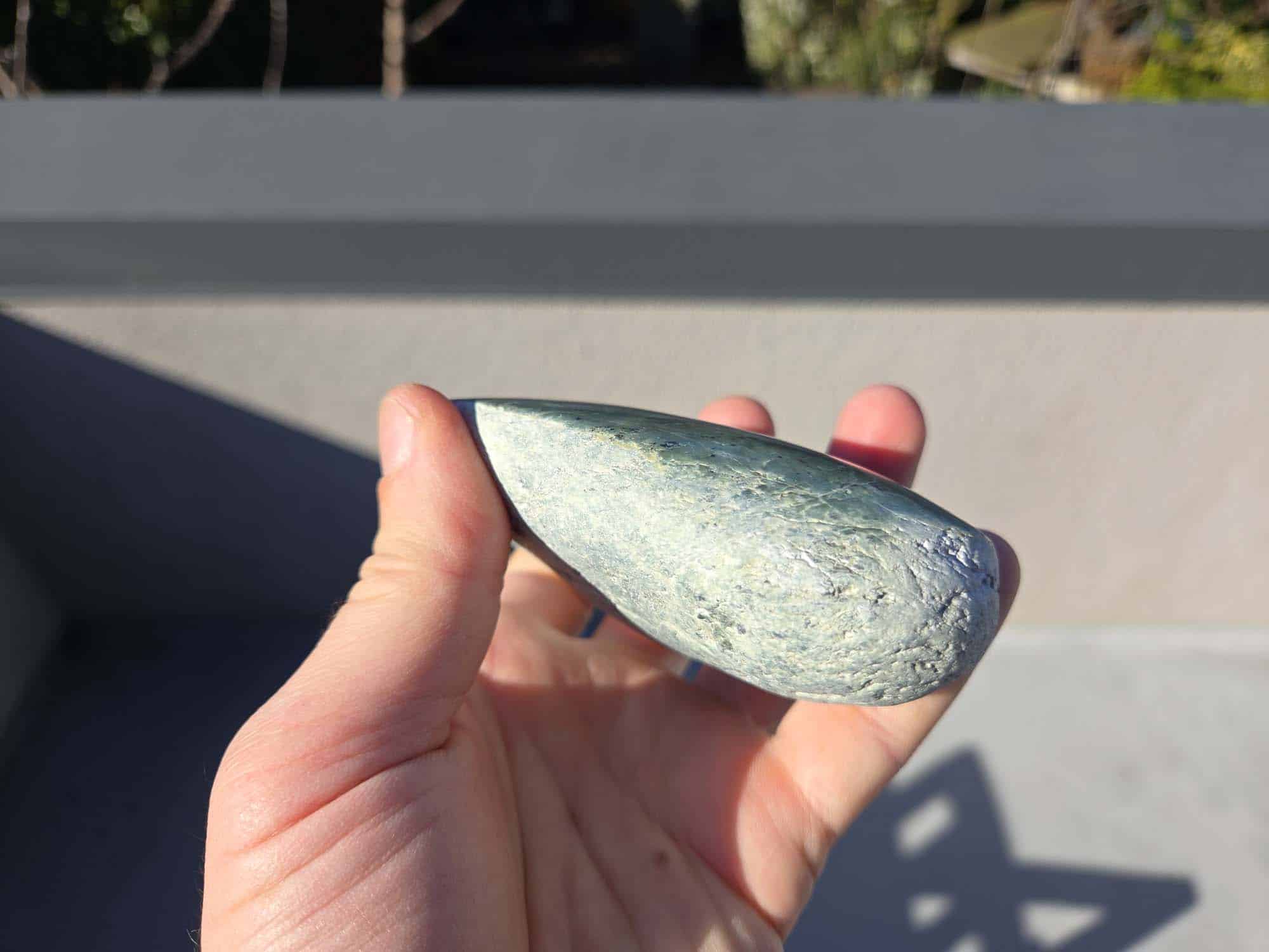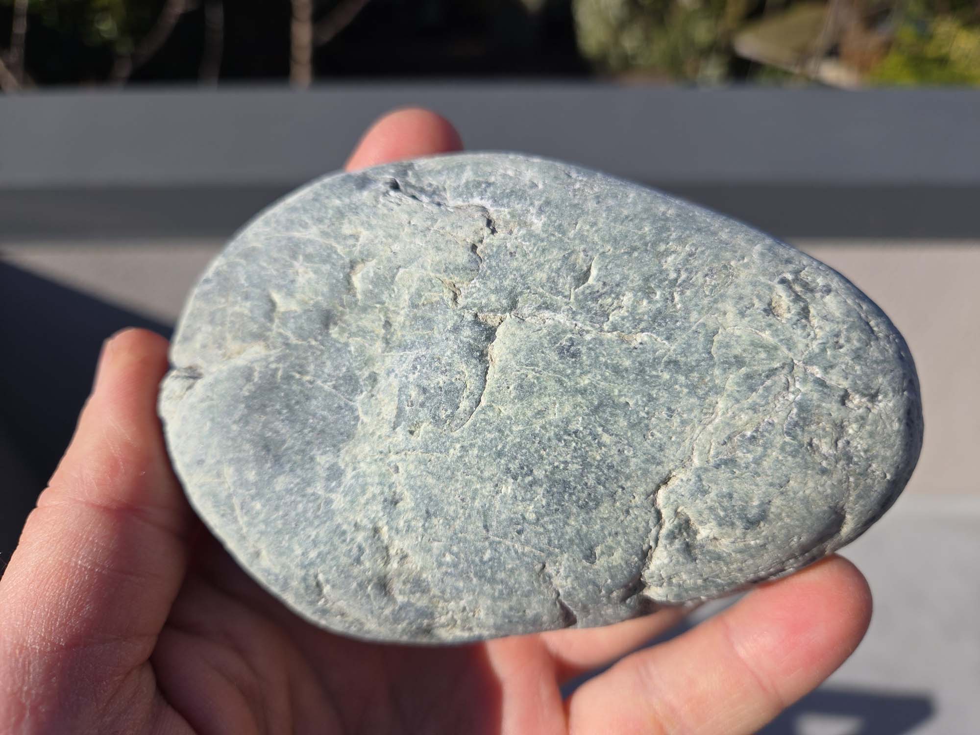 This cobble is carved from serpentine Pounamu, one of the most recognisable and admired types of greenstone. Measuring 11cm long, 8cm wide, and 3cm high, it has a substantial presence while still being easily handled. The stoneâs polished face reveals dramatic feathering and natural patterns. The opposite side remains untouched, keeping the natural skin intact and reminding us of the stoneâs origins in the whenua.