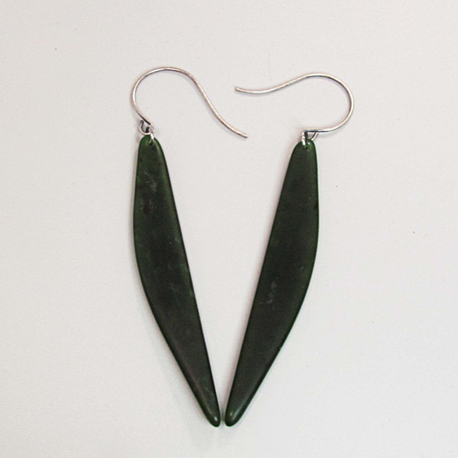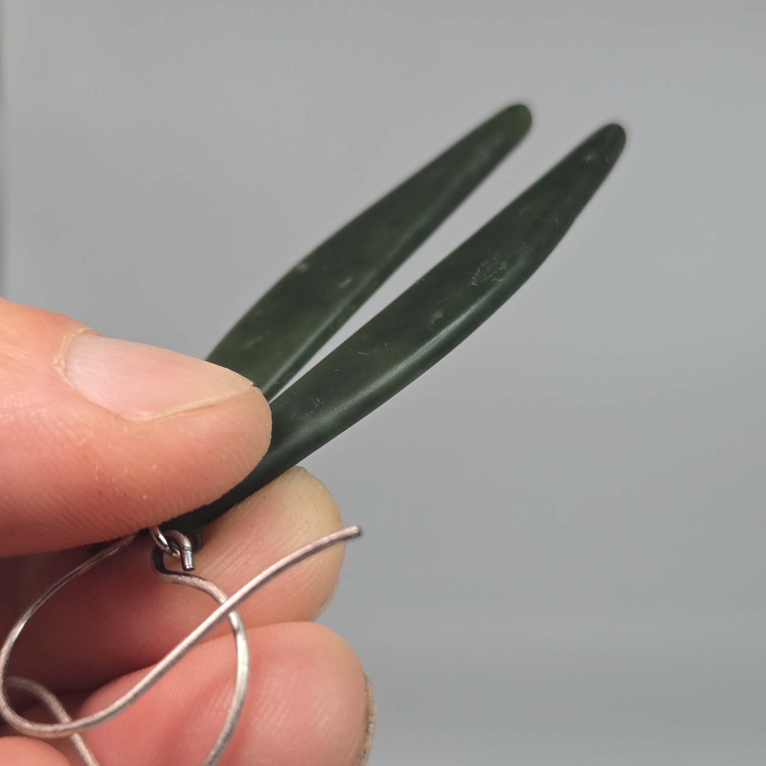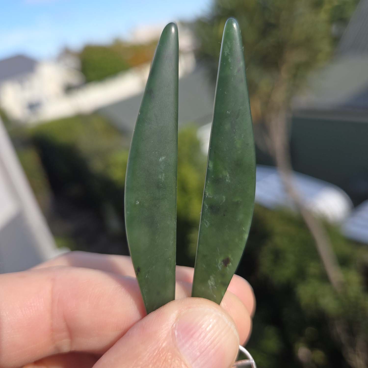 These matching Kawakawa Pounamu earrings have a graceful flowing shape with one straight edge and a gentle outward curve on the other. Around 65mm long (plus the hooks), they taper from the top to a softly pointed base with a subtle outward curve. The deep green stone shows beautiful translucency when held up to the light, revealing the natural character within the Pounamu.