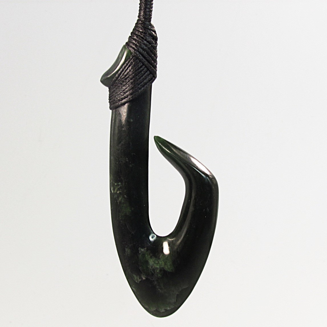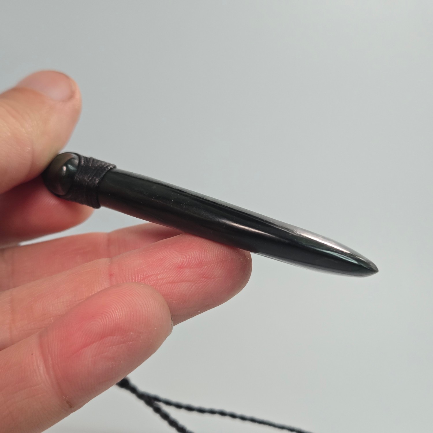 A black lashing secures the piece at the top, simple and unobtrusive, allowing the Pounamu to remain the focus. The cord sits comfortably with the form, completing the taonga without taking away from its presence.