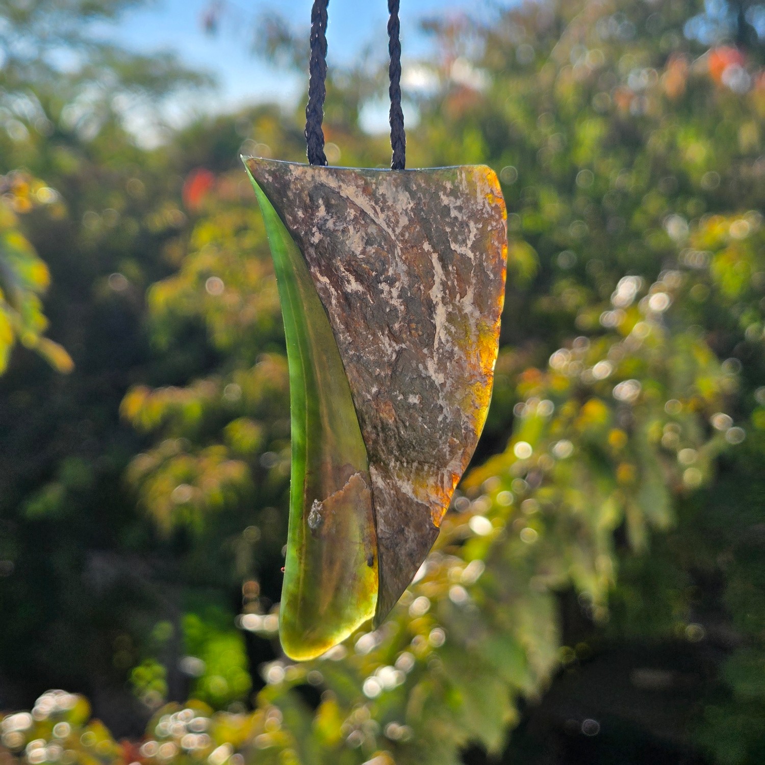 A 75mm niho carved from deep green Kawakawa Pounamu, revealing both polished stone and its natural rind. One side is smooth and finished, while the other holds the dark, oxidised skin of the stone, grounding the piece in its origins. The niho appears to emerge from the raw form itself, reflecting its name â a tooth born from the land. Bound with a hidden hole and black three-braid cord, this taonga carries strength shaped by whenua and the journey from raw stone to finished form.