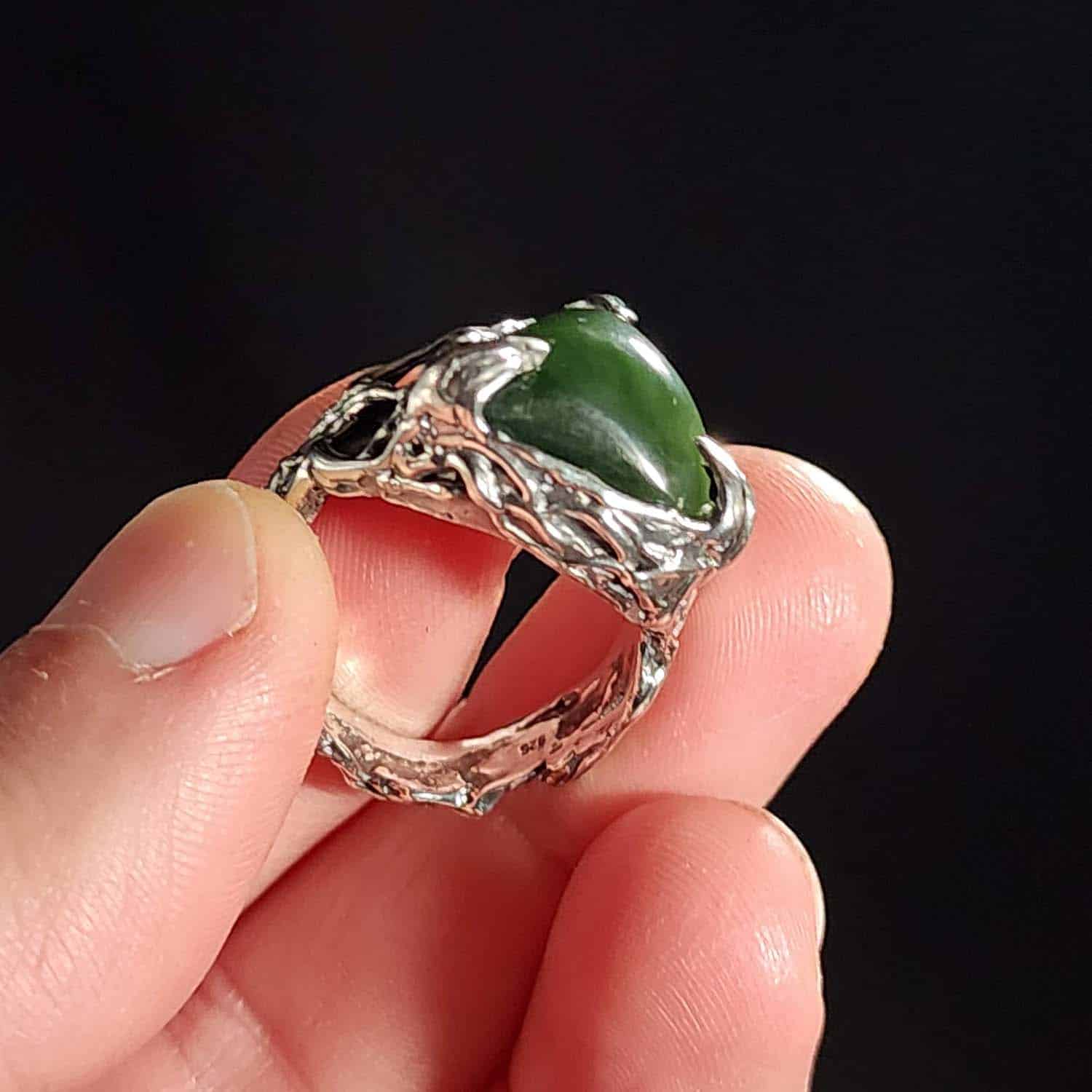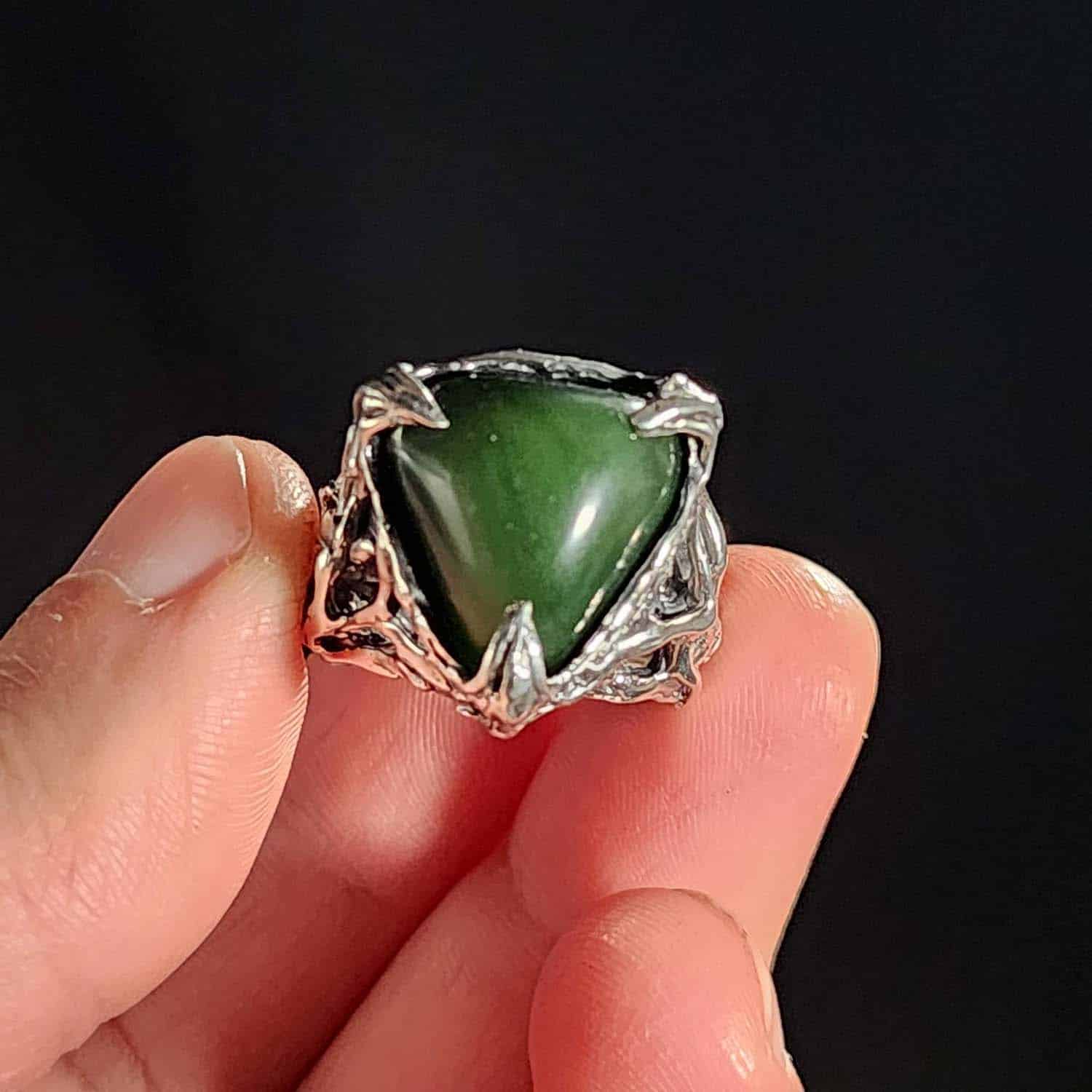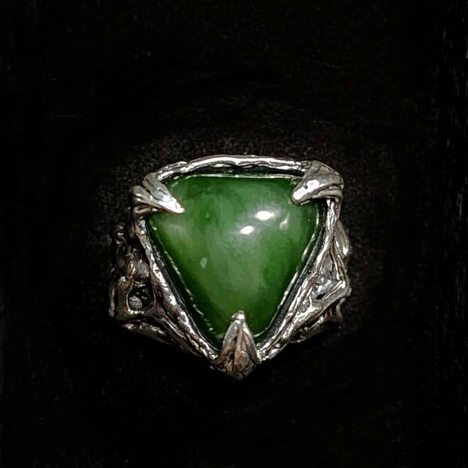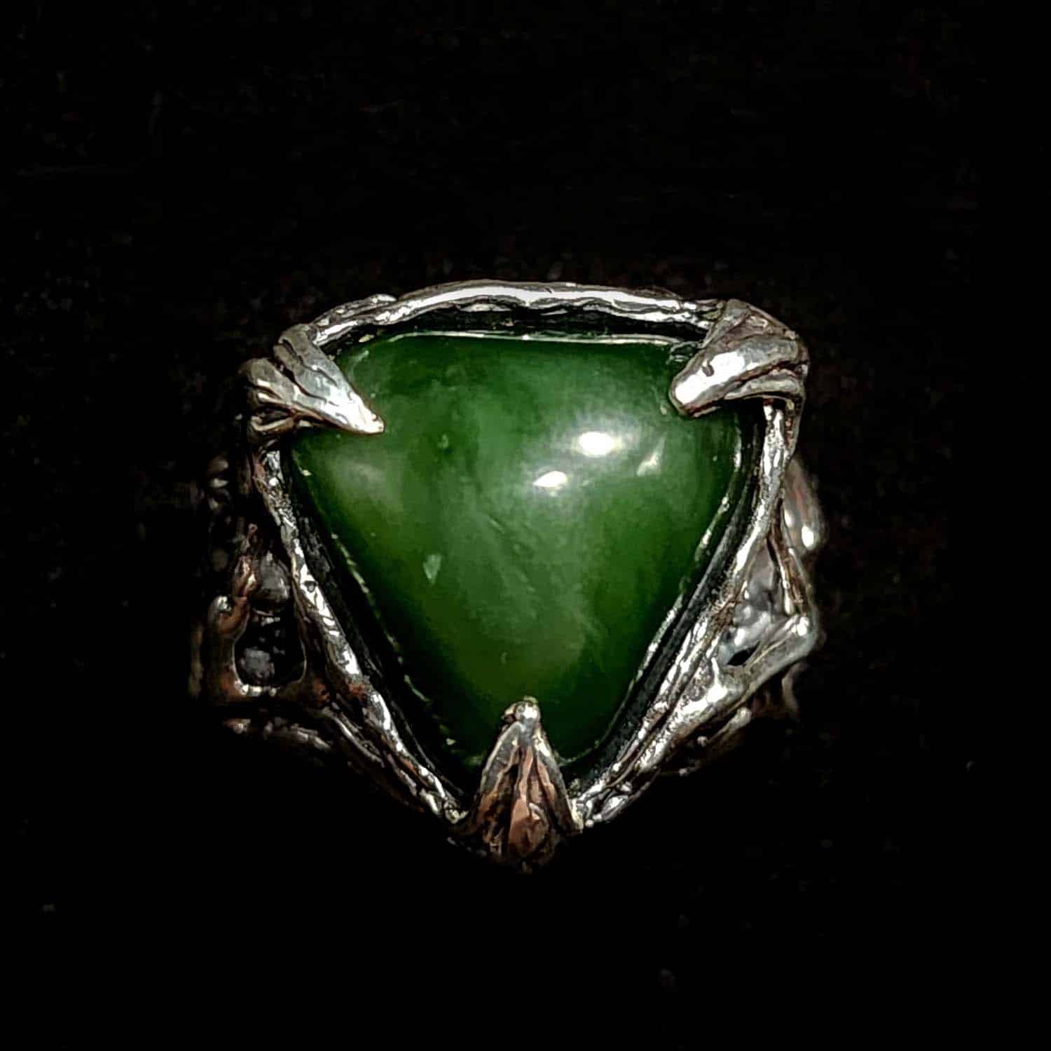 This striking Kawakawa Pounamu silver ring features a smooth triangular (tapatoru) cabochon carved by hand and set in sterling silver. The stone is 16mm wide with rich green depth. The silver setting was custom designed by M.V.H Jewellery using the ancient lost wax casting method. Three organic silver claws hold the stone in place, weaving around it like flowing vines. A unique and powerful taonga.