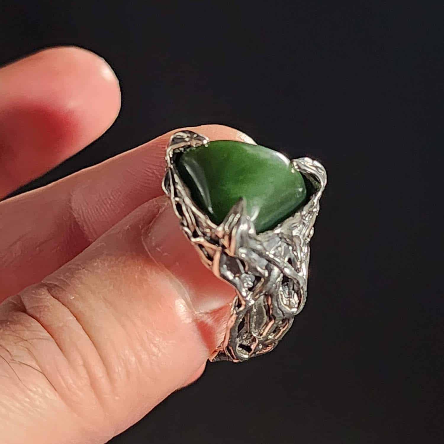 Manawa Kākāriki — Green Heart — is a unique Kawakawa Pounamu ring. The 16mm triangular cabochon was carved from deep green Kawakawa stone and polished to a smooth, flowing form. It’s set in handcrafted sterling silver by M.V.H Jewellery using the lost wax casting method, a technique dating back thousands of years. The organic silverwork wraps around the Pounamu like vines or veins, with three claw-like prongs securing the stone visually and symbolically.
