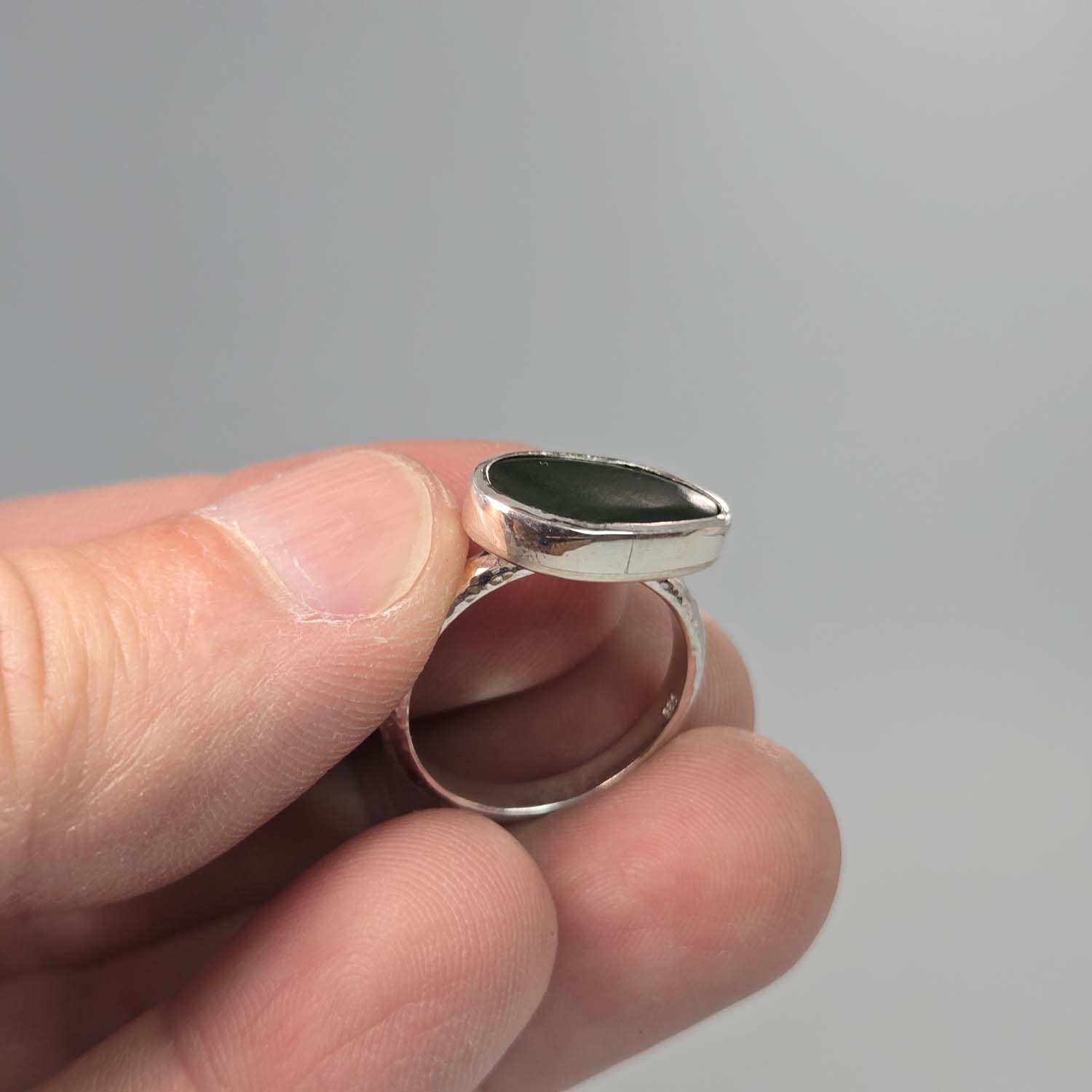 This sterling silver ring features a dark green Kawakawa Pounamu cabochon with a flat, freeform top. The low profile makes it practical for everyday wear, while the hammered silver band adds texture and character. A strong, understated piece that carries the depth and mana of Pounamu in a clean, wearable design.