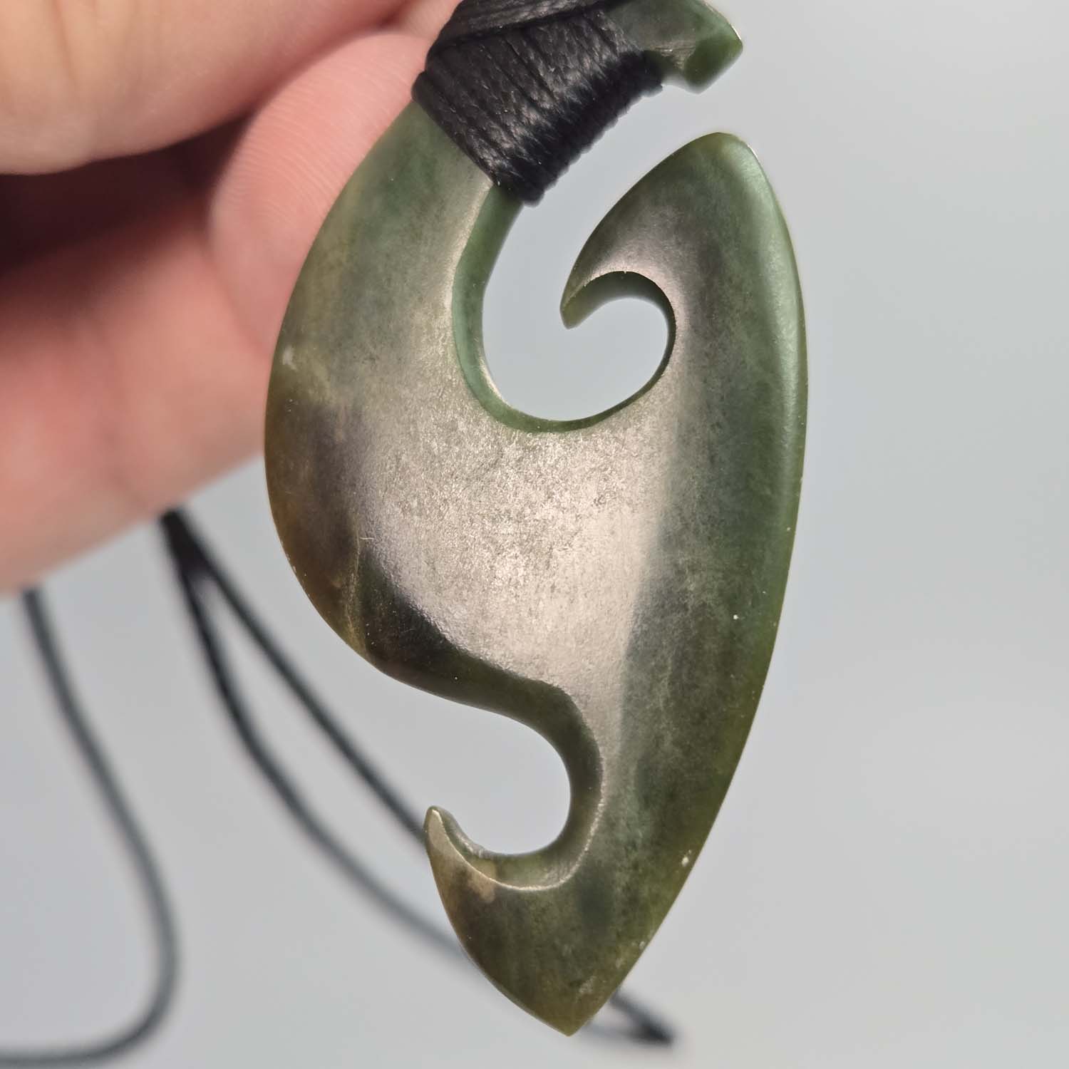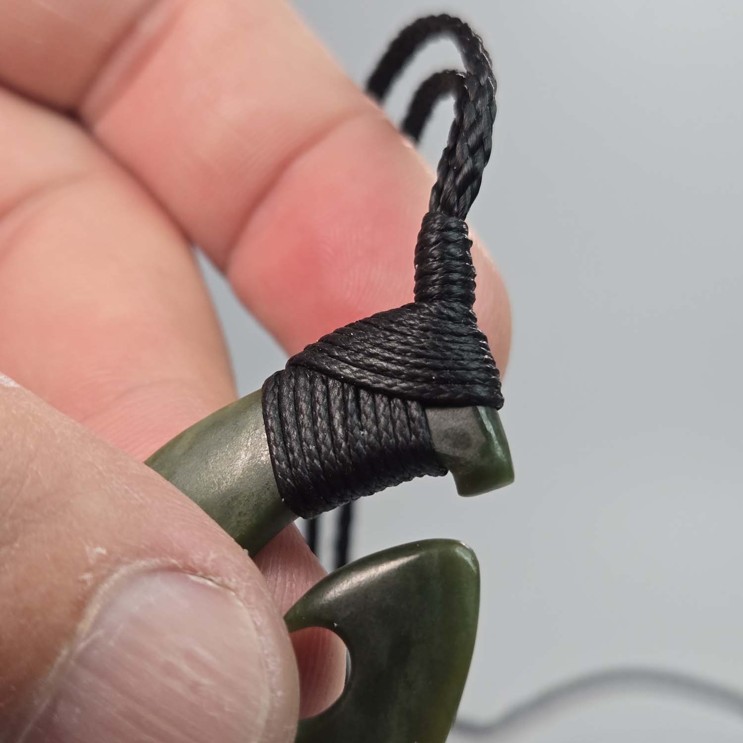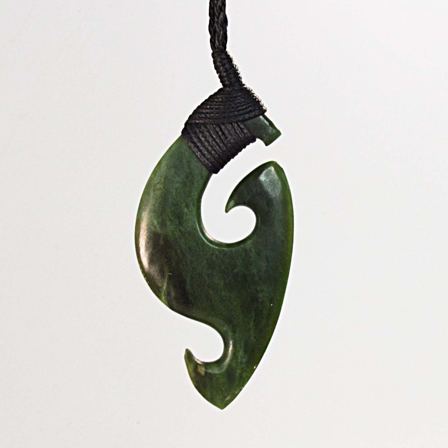 This Hei Mātau is carved from Kawakawa Pounamu, known for its rich, deep green tones. The stone has a solid, grounded presence that suits the meaning of the mangopare well. At 60 millimetres long, it has a strong visual impact without being oversized. The black lashing and cord keep the focus on the stone and the carved detail, giving it a clean and balanced finish.