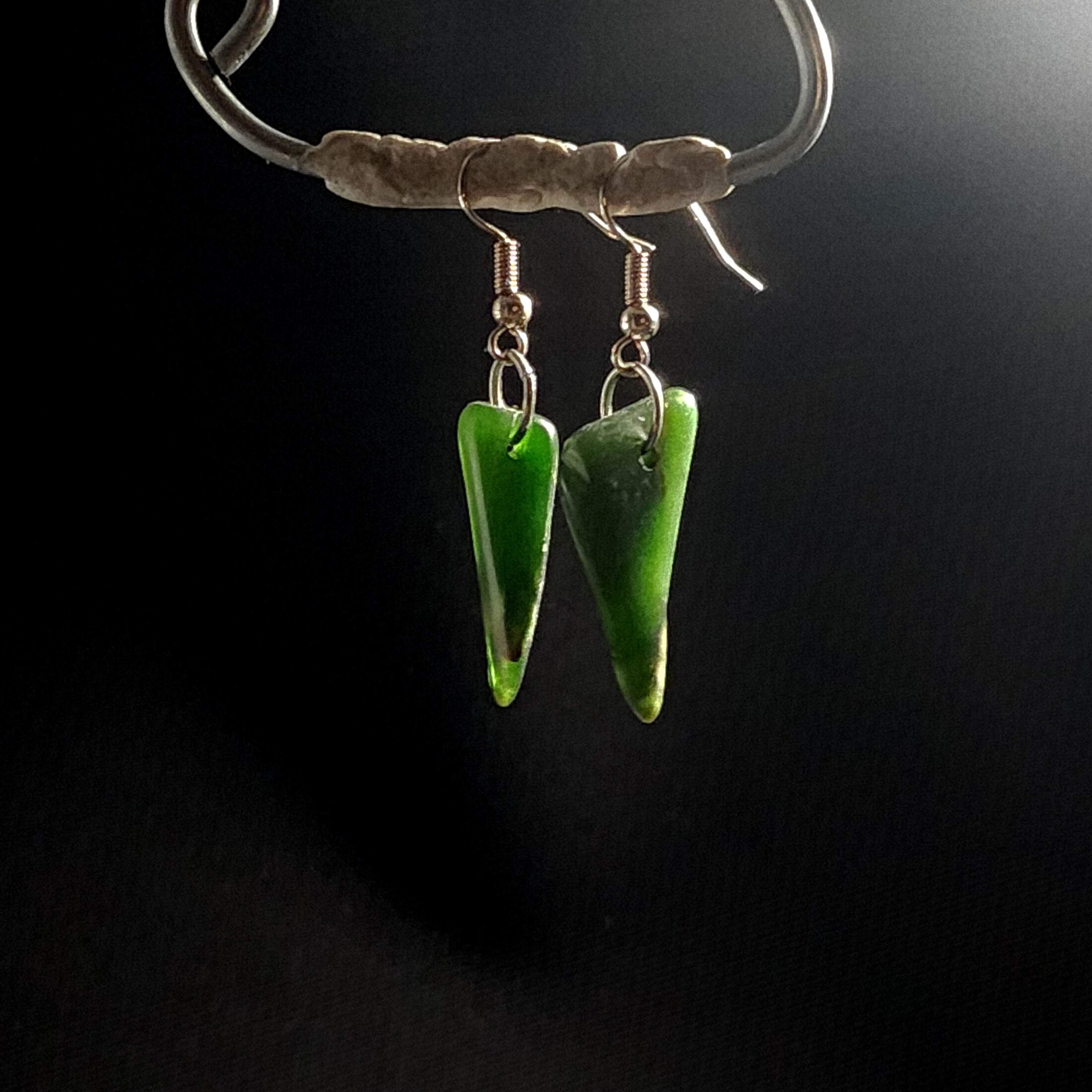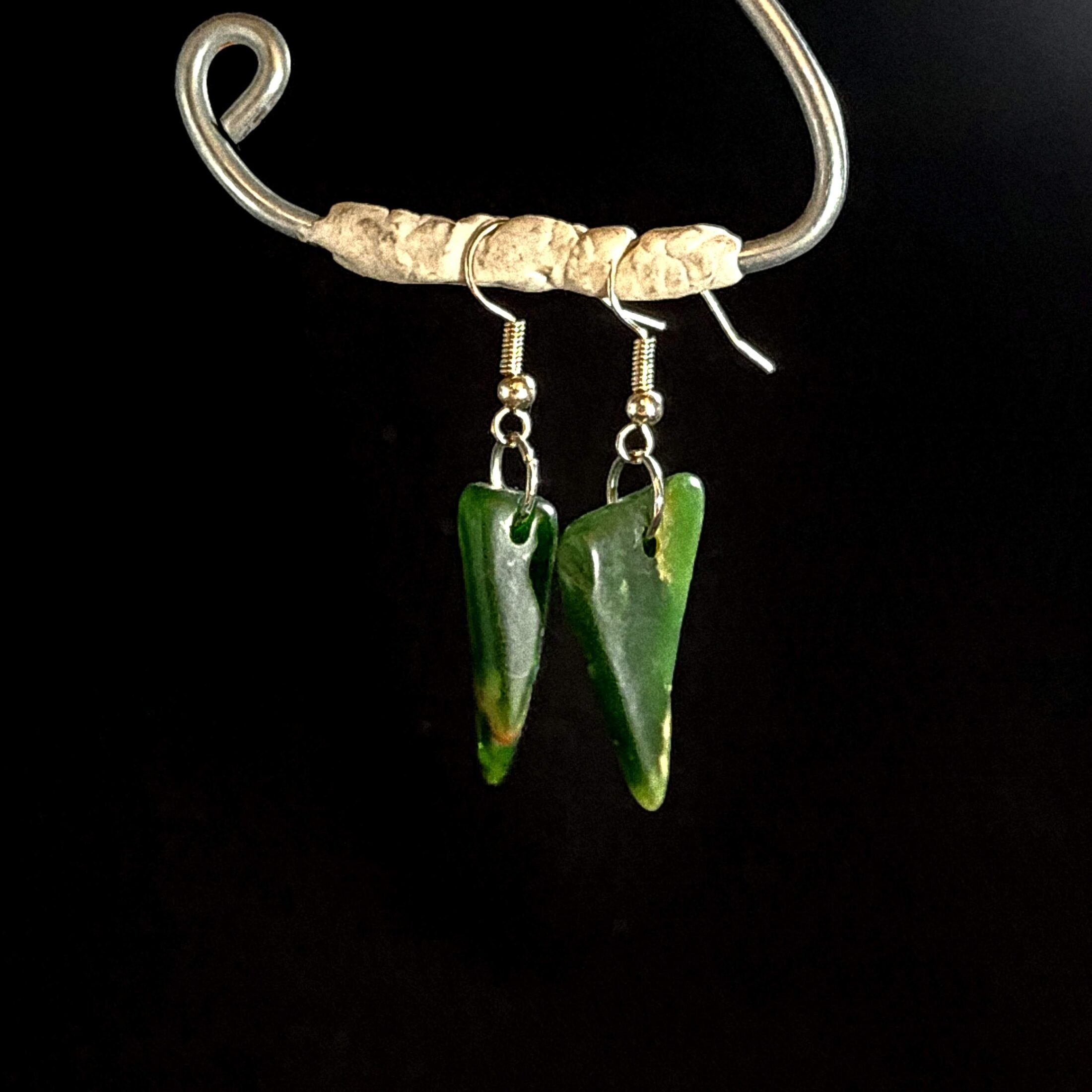 A stunning set of Marsden Flower Jade earrings, shaped like a naturally matching pair of small niho. These gem-quality Pounamu pieces were tumbled smooth to bring out their natural glow—rich green tones and golden flower-like patterning that speak to the living beauty of the stone. Their form and origin hold meaning beyond appearance, carrying the strength and protection of the niho shape and the deep connection that Pounamu brings.