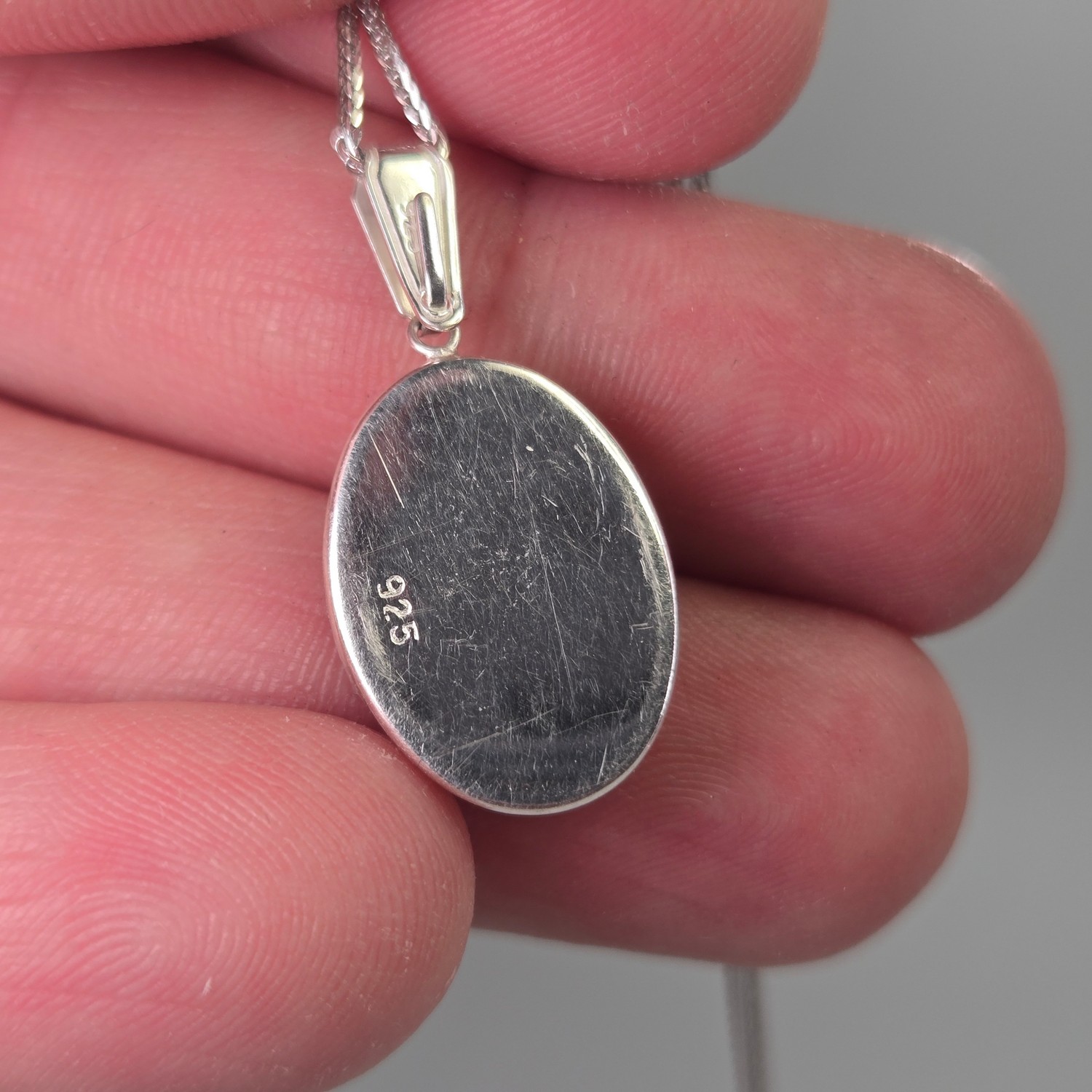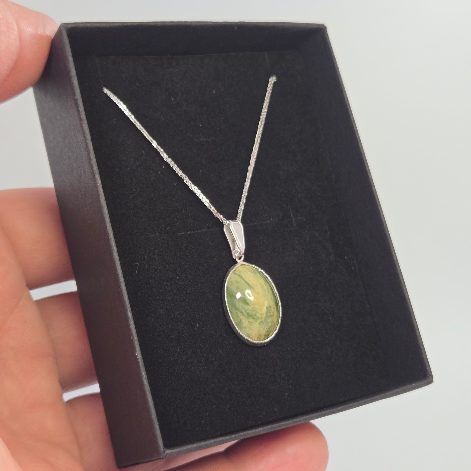This oval pendant features Marsden Flower Jade Pounamu set in a sterling silver mount, highlighting its natural apple green tones and distinctive flower-like patterning. The cabochon dome shape softens the light across the surface, bringing out the depth and movement within the stone. Measuring 16mm by 13mm, it sits neatly on a silver chain with a secure sterling silver clasp, ready to wear. The oval form offers a simple, balanced design that lets the natural beauty of the Pounamu stand out.