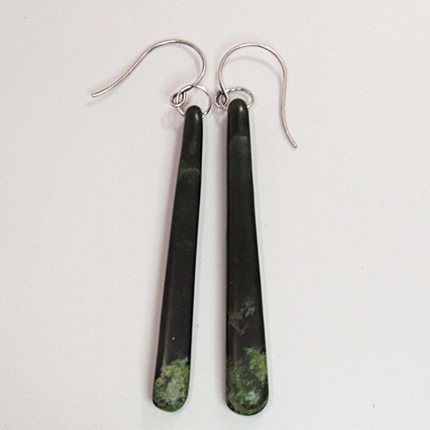 These earrings are carved from Marsden Flower Jade Pounamu, known for the distinctive putiputi (flower) inclusions that appear within the stone. The deep dark green base colour provides a rich background for these natural formations, which gather near the base of the earrings and stand out beautifully against the darker tone of the Pounamu.