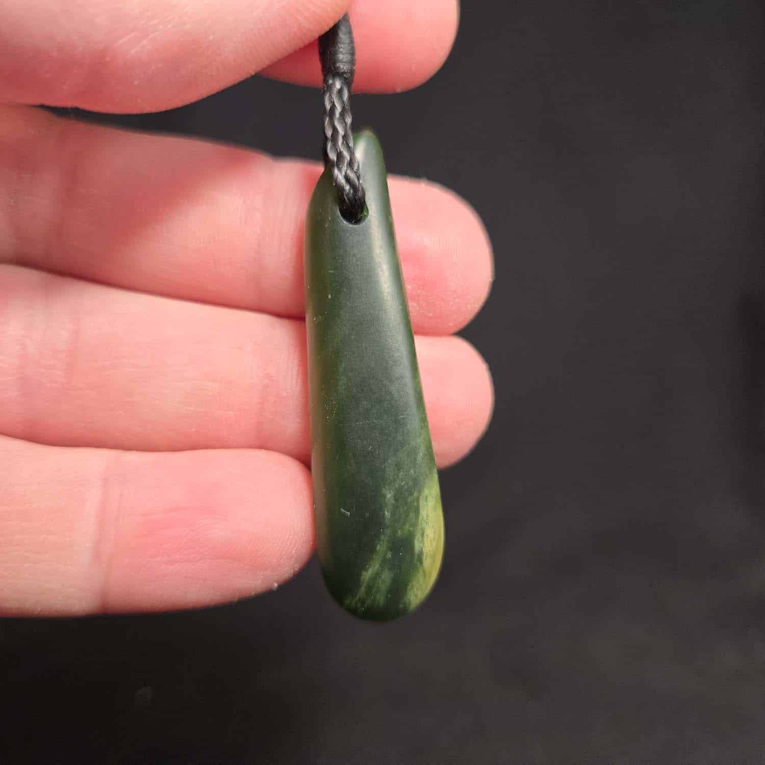 This 50mm Roimata is carved from Marsden Flower Jade with rich green colour and golden flowering throughout. The base is fully rounded, giving the piece a smooth, flowing form. With a curved front and flat back, itâs suspended by a simple hole on a black cord â a timeless and meaningful taonga.