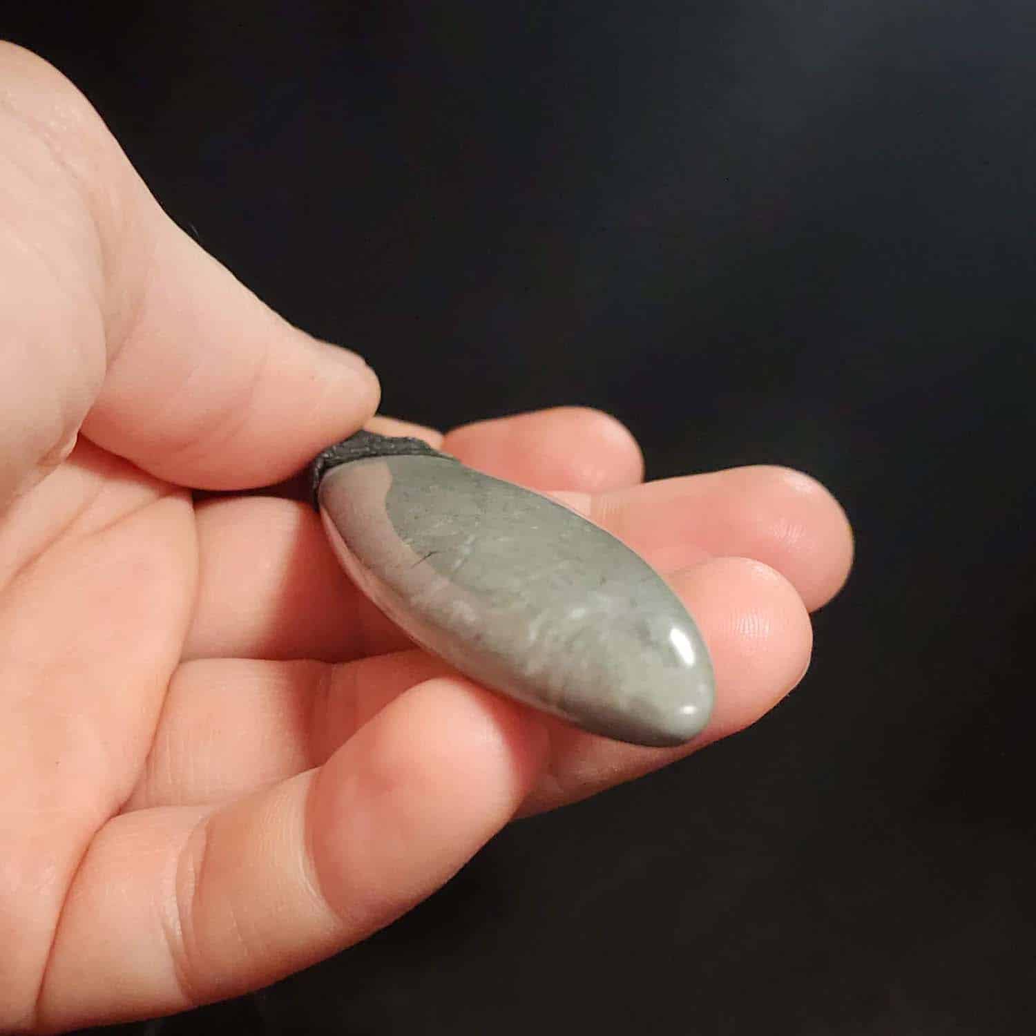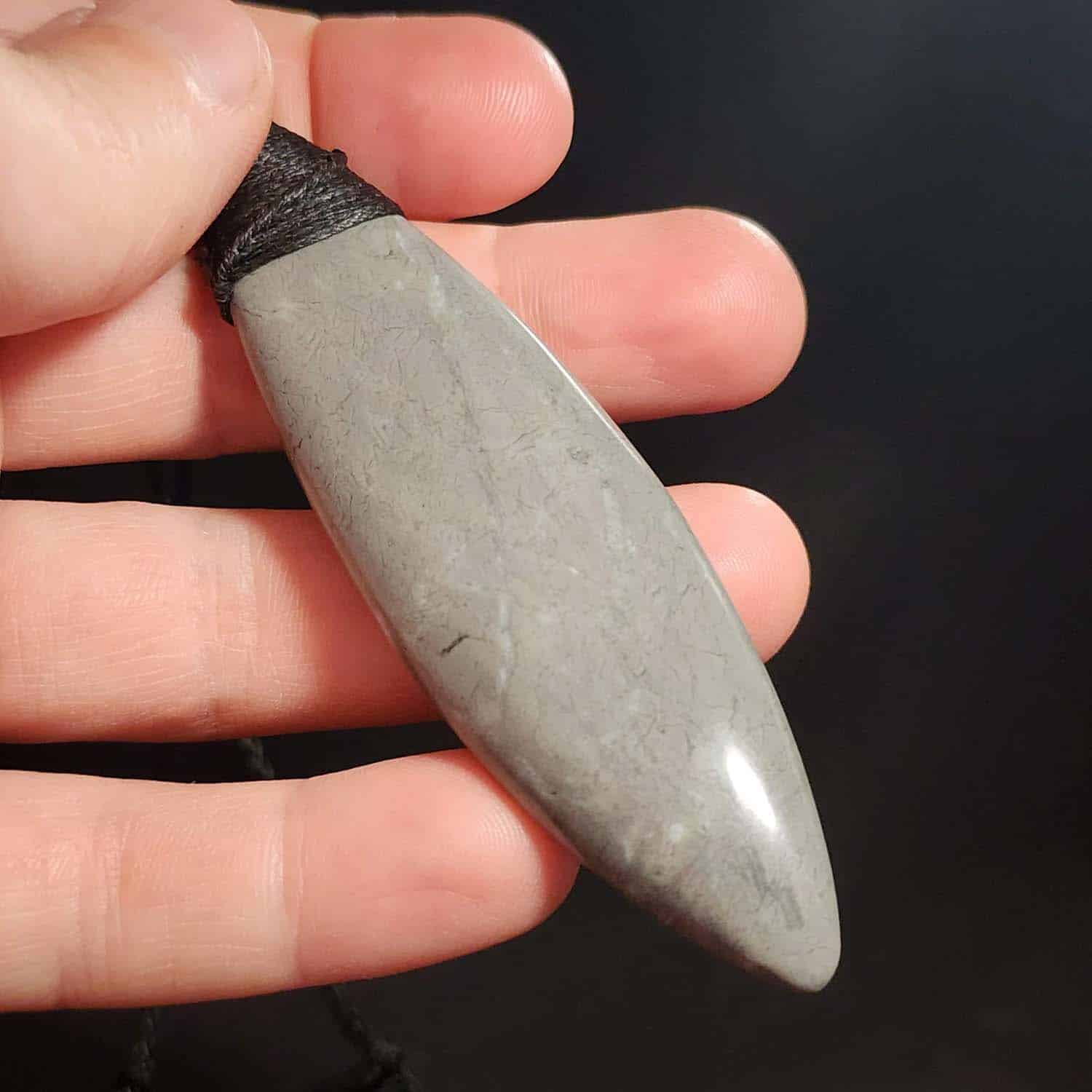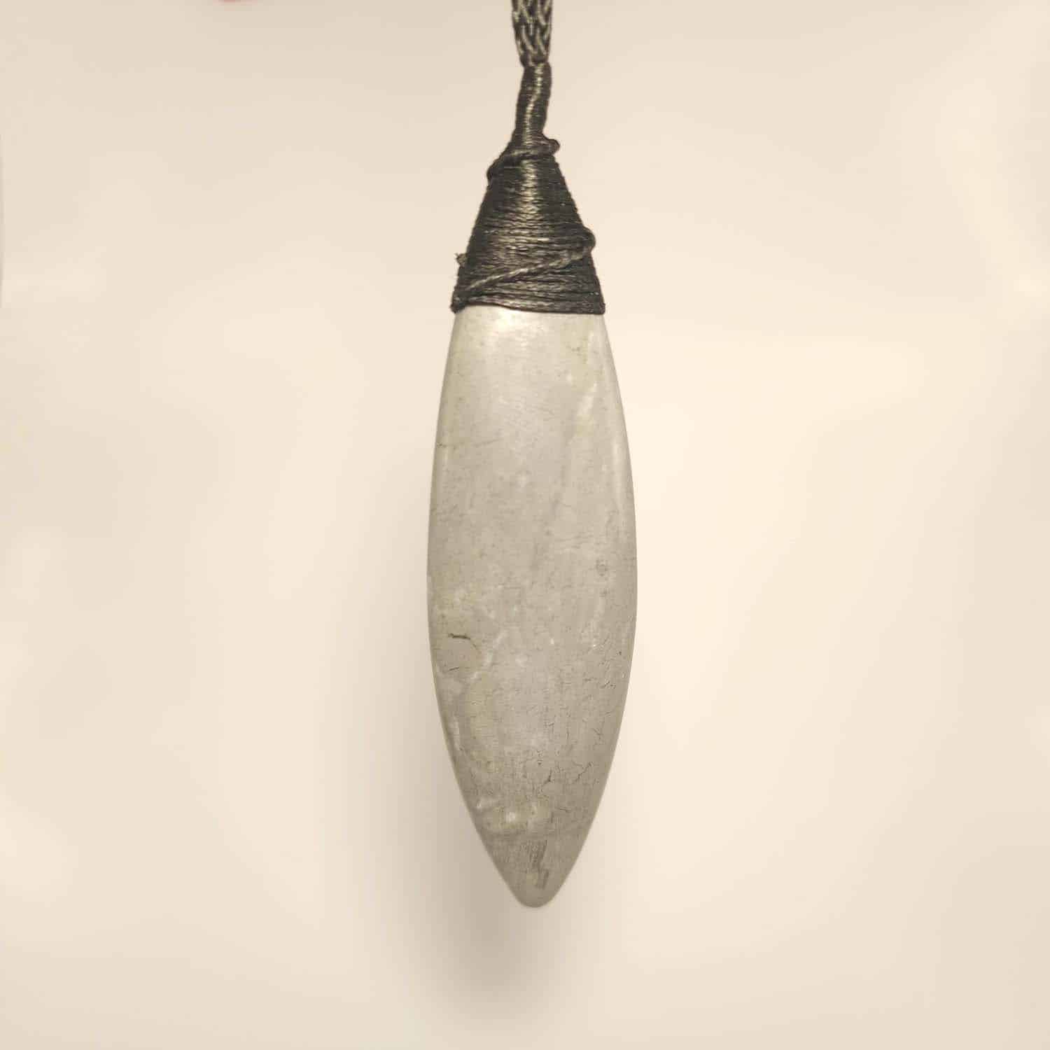 The taonga is gently tapered at both ends, with smooth, flowing curves that invite touch. It’s bound with a sleek black spiral lashing, grounding the piece in tradition and contrast. As a Roimata (tear drop form), this pendant represents the flow of emotion — grief, healing, and compassion. It also symbolises connection and aroha, making it a powerful gift or personal taonga to carry your story.