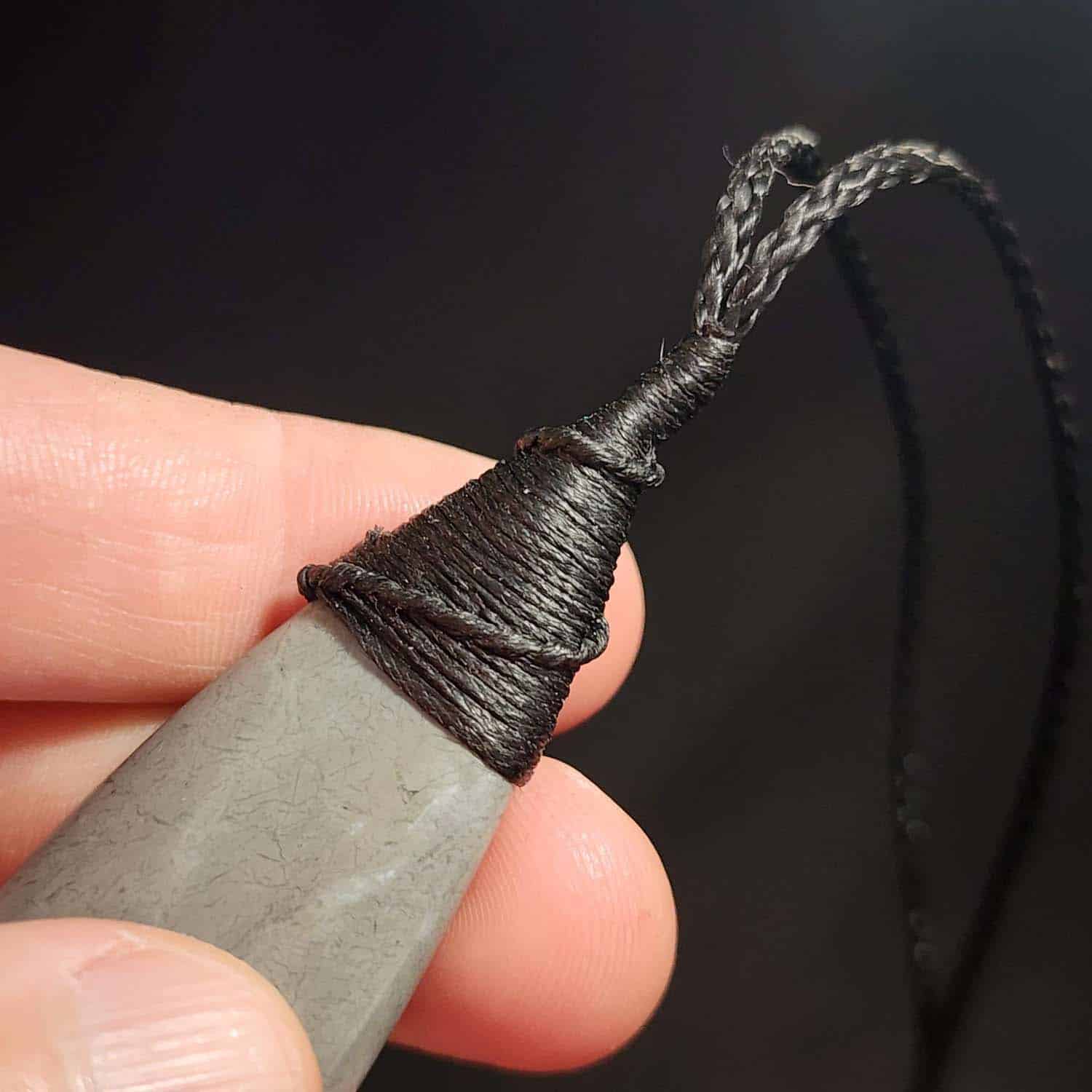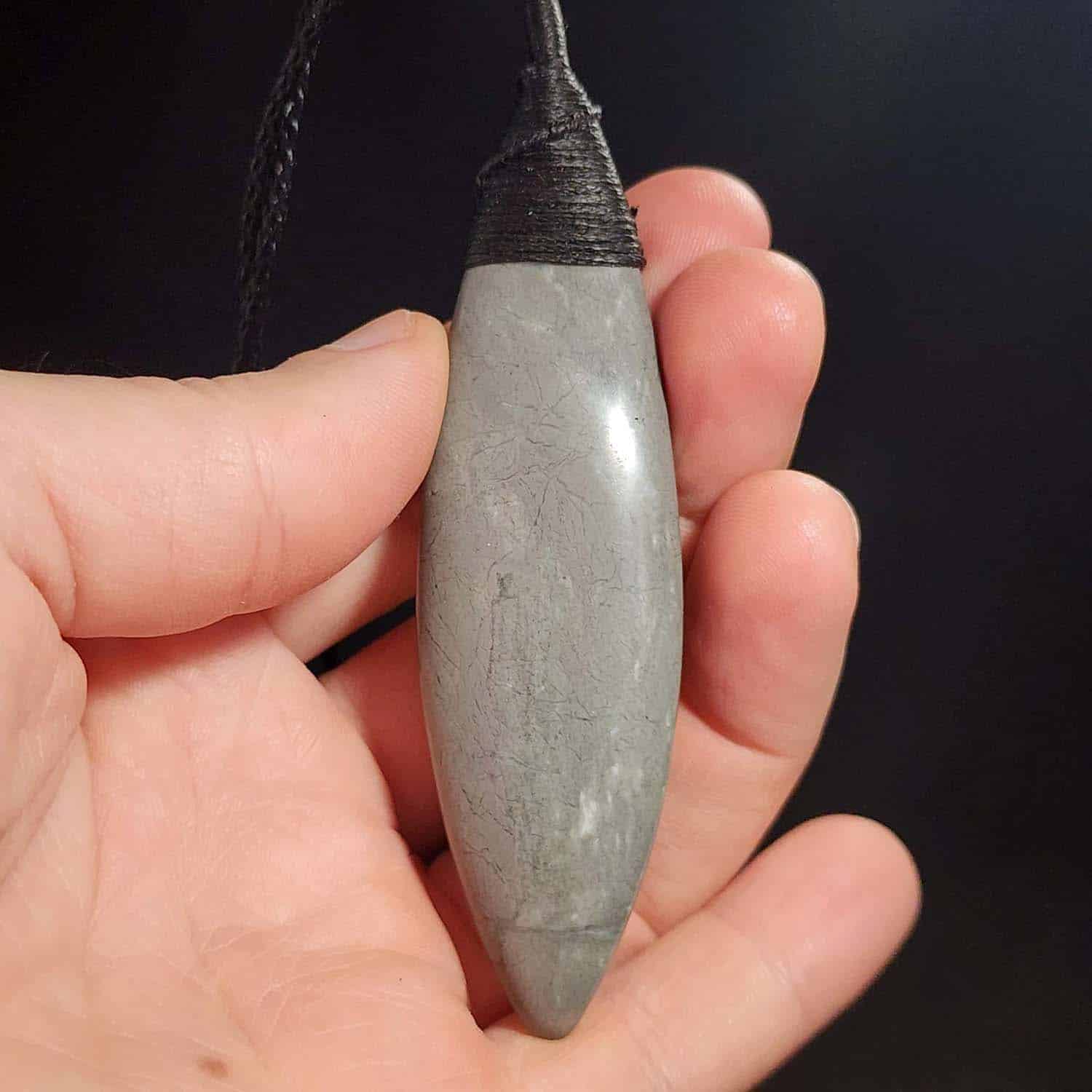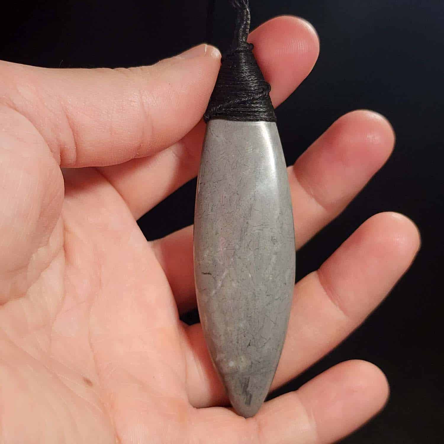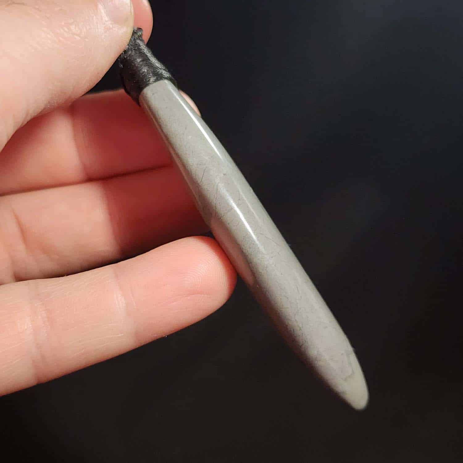This 90mm taonga is carved from Marutea Pakohe, a dense and fine-grained form of argillite. Tapered at both ends with flowing curves, it’s lashed with a black spiral binding. The Roimata form symbolises healing, connection, and the release of emotion. This piece carries the grounded strength of Pakohe, treasured by Māori for generations as a tool and taonga stone.