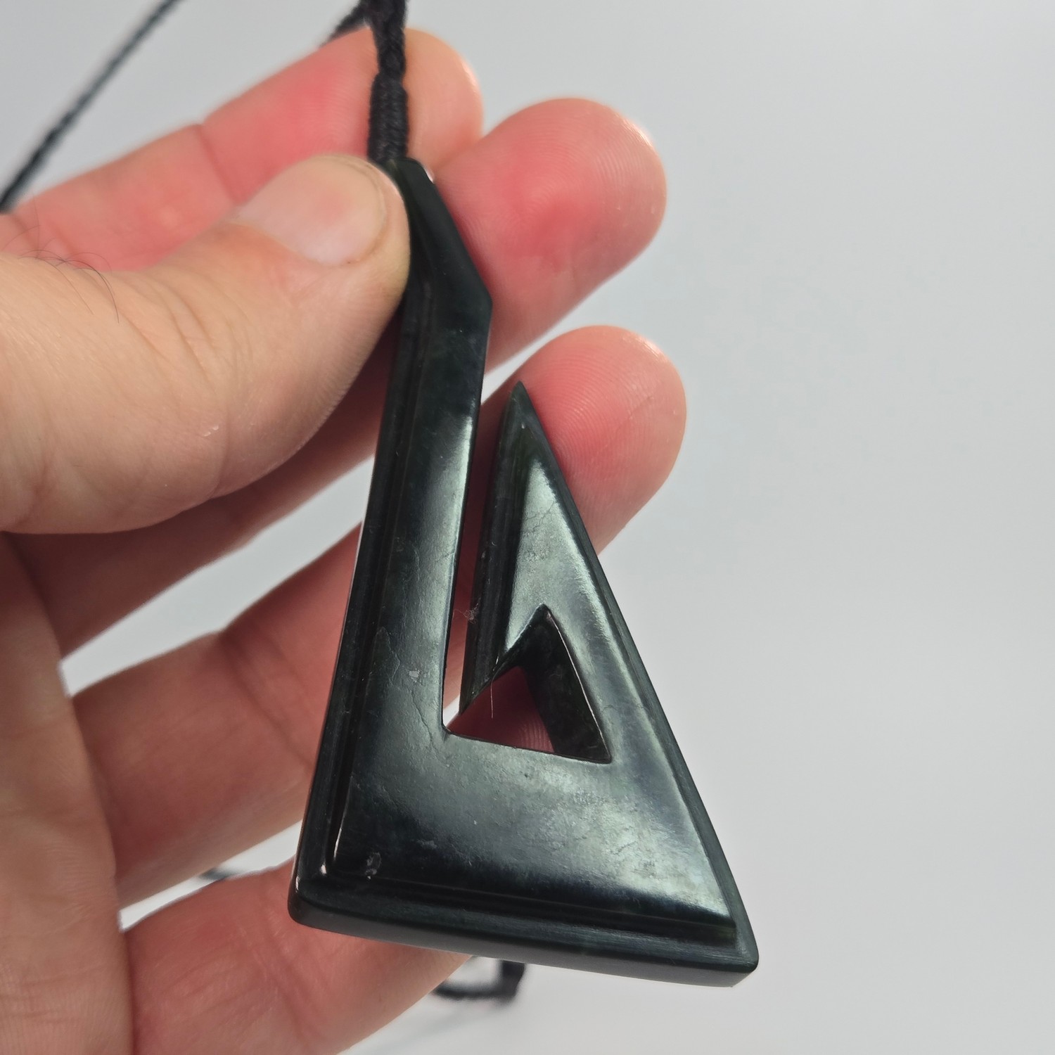 A modern, angular Hei Matau carved from deep green Kawakawa Pounamu. Strong lines, recessed bevels, and defined edges give this piece a grounded, purposeful presence. Bound with a black cord, it carries a sense of direction, strength, and deliberate movement.