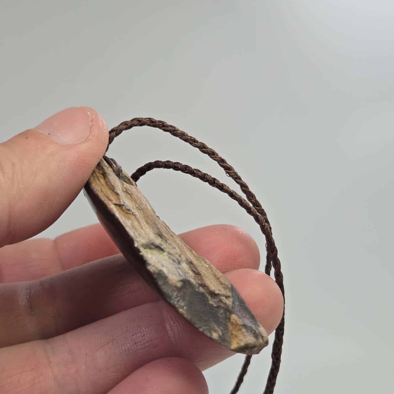 At the top, a three-hole ringbolt lashing secures the taonga, finished with a deep brown 3-plait cord that complements the dark and caramel tones within the stone. The Niho shape symbolises strength, resilience, and determination — qualities that align perfectly with the story of this ancient material.