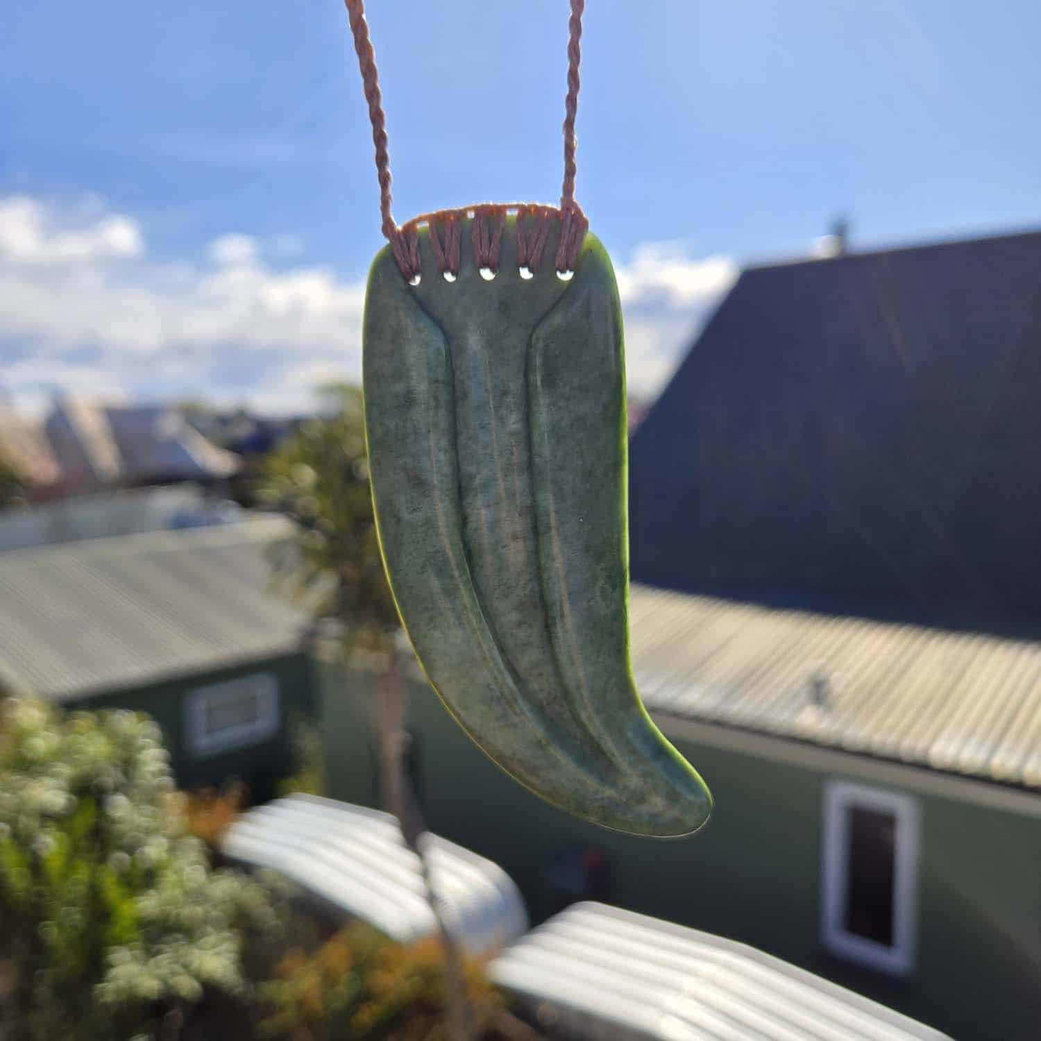 Carved by David Curtis, this 90mm niho carries a flowing, curved form. A carved groove runs down the middle, creating the impression that the upper edges fold inward, adding depth and movement to the design. The pale green Pounamu glows beautifully when held to the light, bringing a living presence to the stone. A five-hole ring bolt lashing at the top secures the piece with a tan cord, grounding the carving with balance and strength.