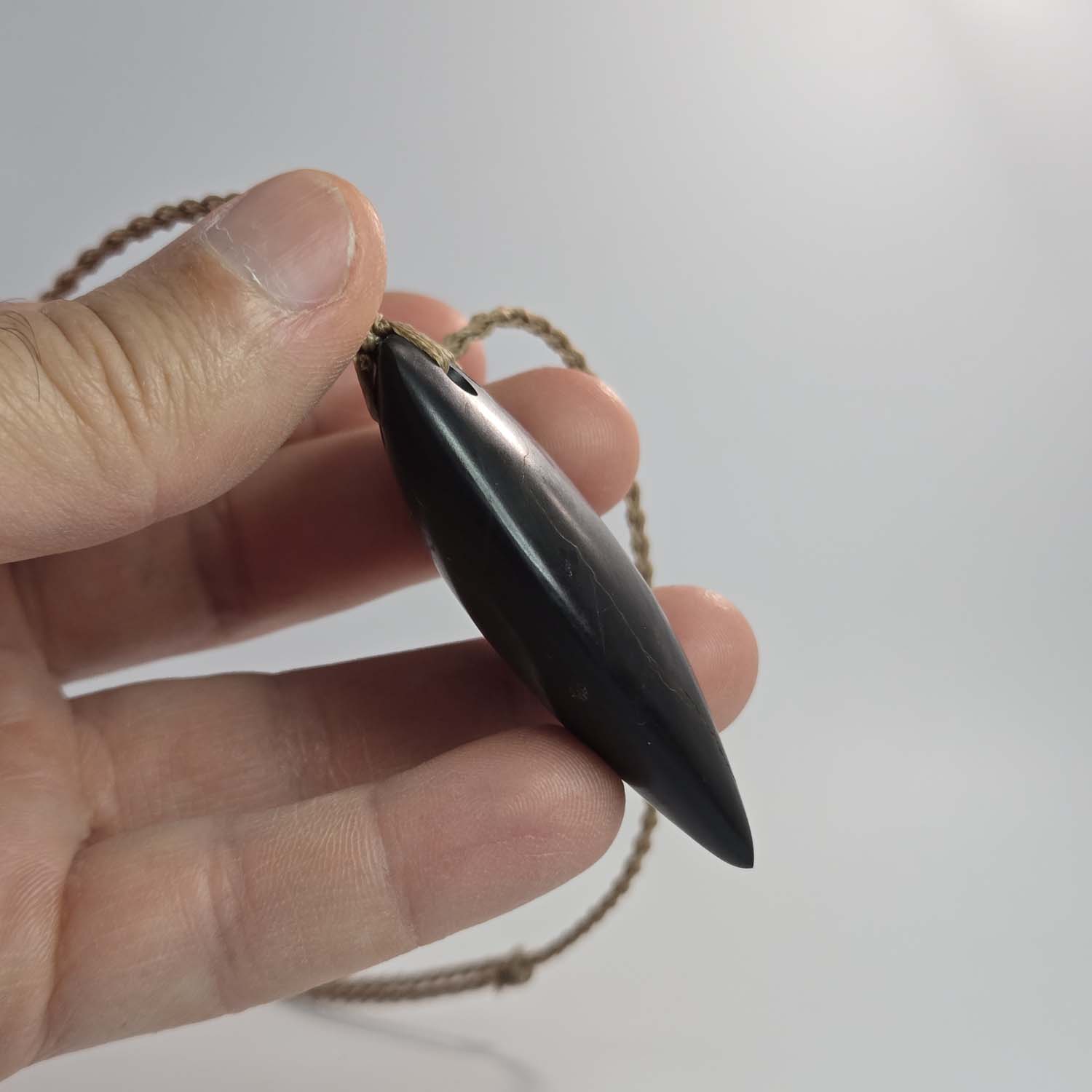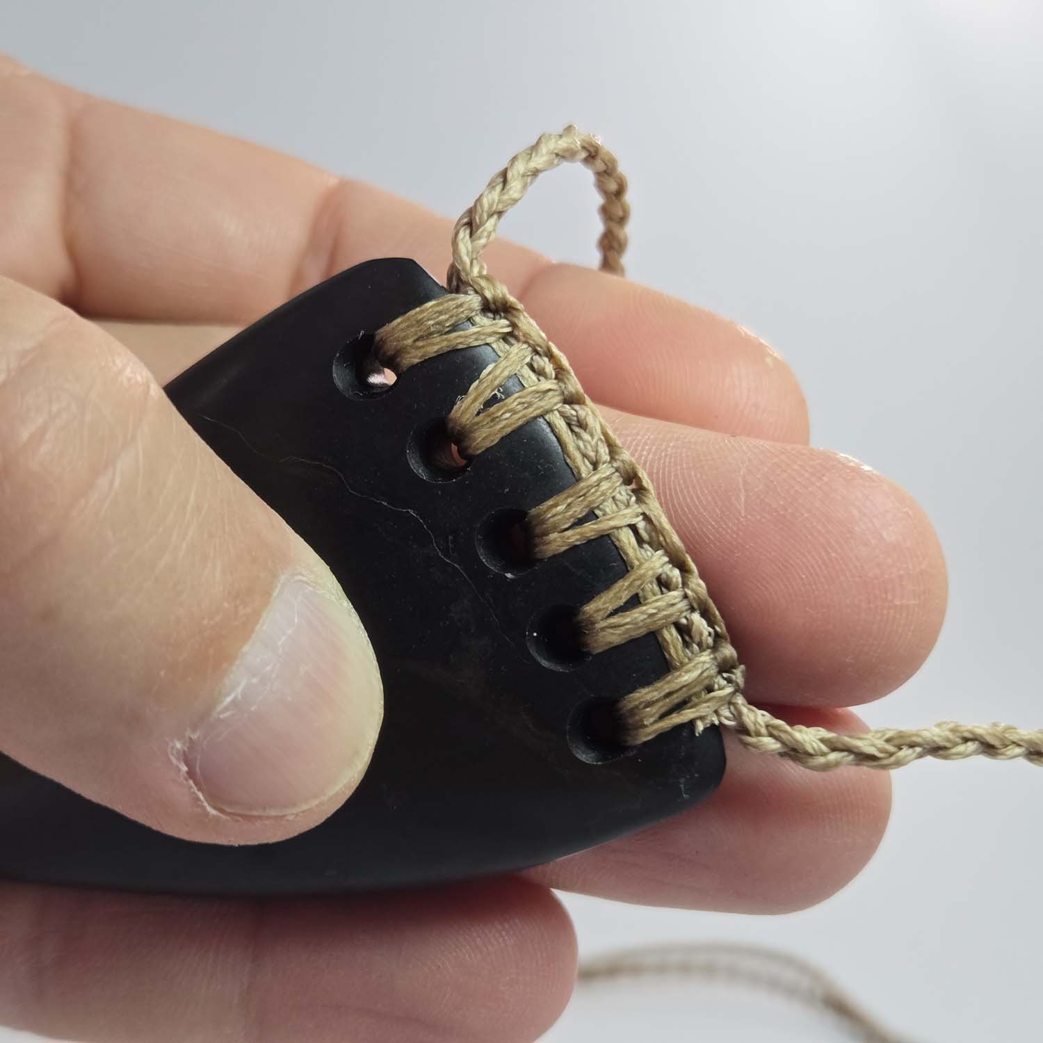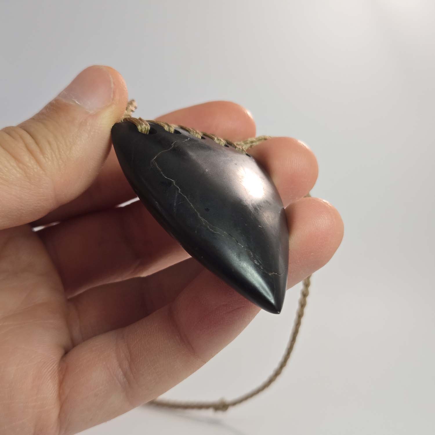 This taonga is carved from dark Ōnewa basalt from Whakaraupō, Lyttelton Harbour. It features a five-hole rainbow lashing across the top on a tan cord that complements the natural tones of the stone.