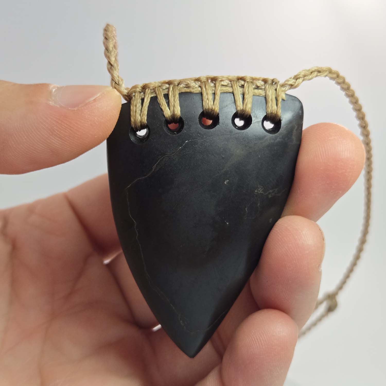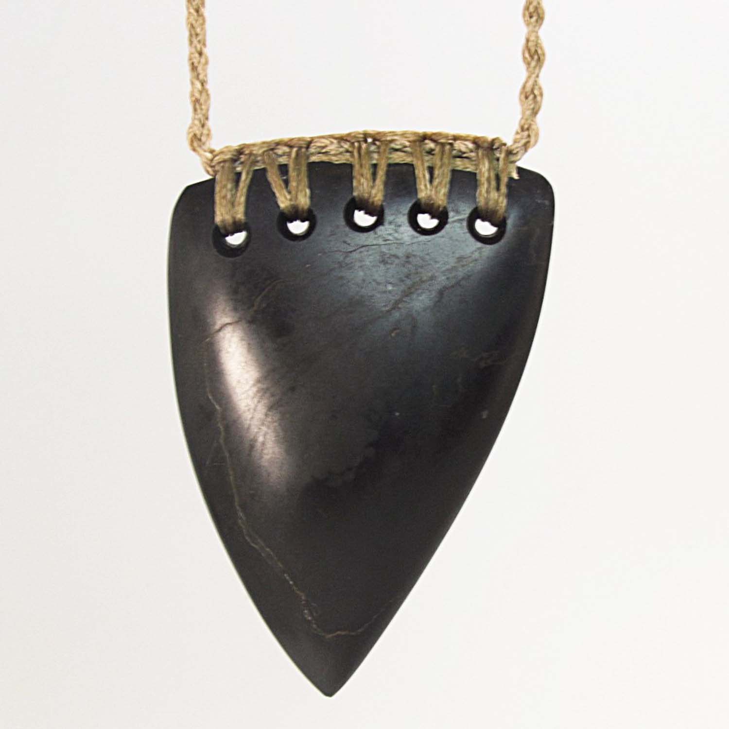 A five-hole rainbow lashing secures the pendant at the top, finished with a tan cord that contrasts subtly with the dark basalt. The result is a bold, grounded taonga that reflects both the strength of the design and the landscape the stone comes from.