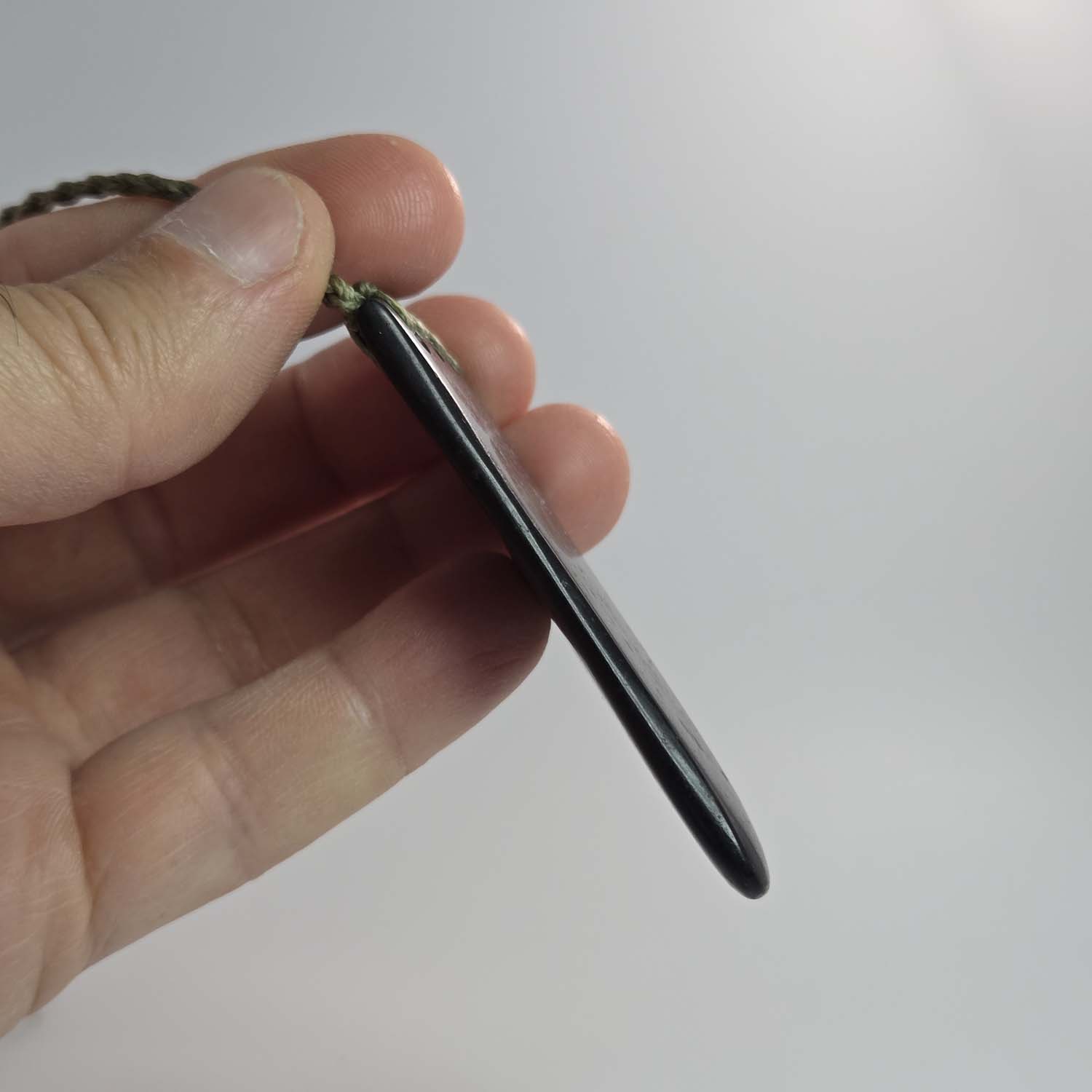 At 65mm long, this piece is slender and gently curved, with softly rounded edges that give it a subtle whale tooth-like form. It is finished with a four-hole ringbolt lashing on a harakeke-green cord that contrasts with the dark basalt.