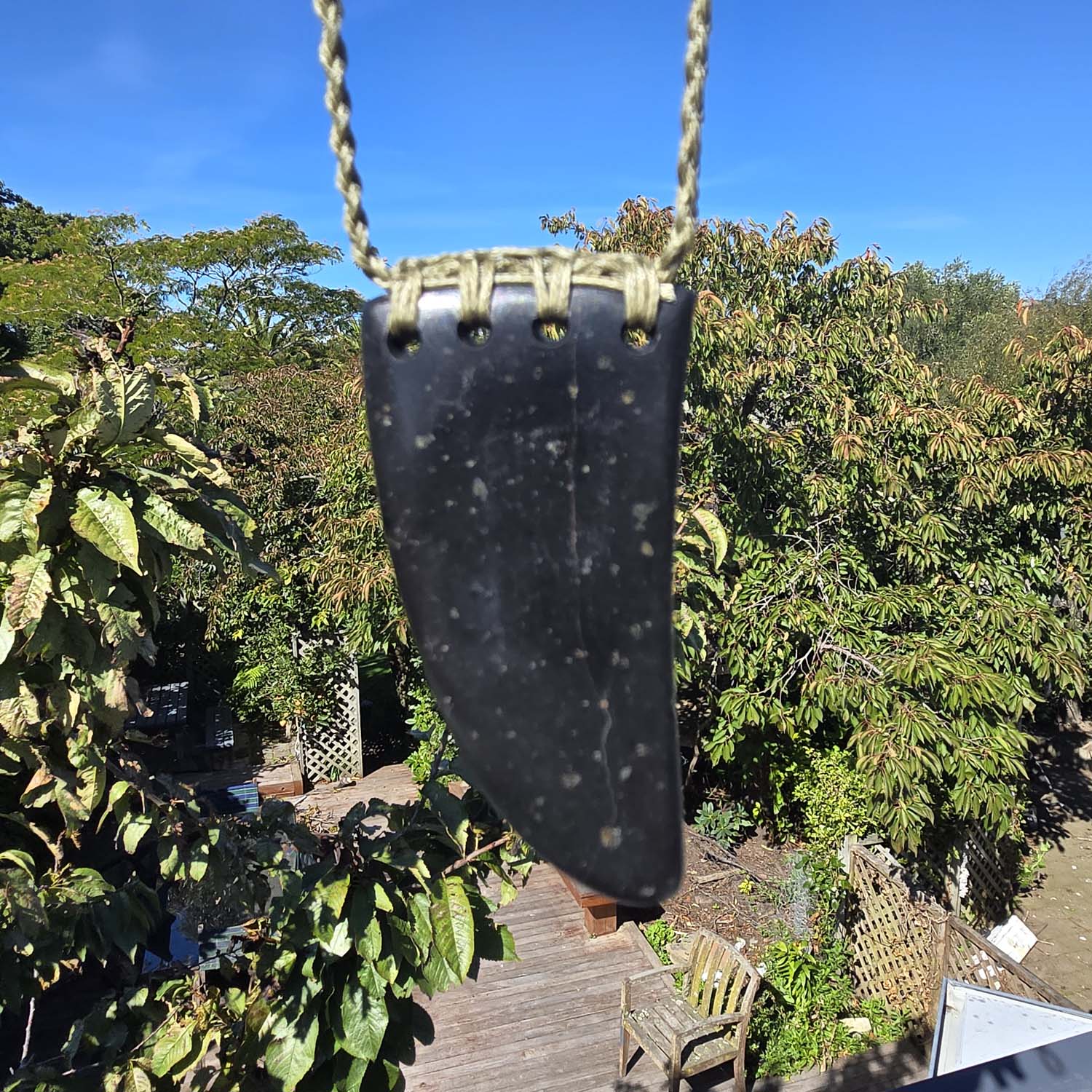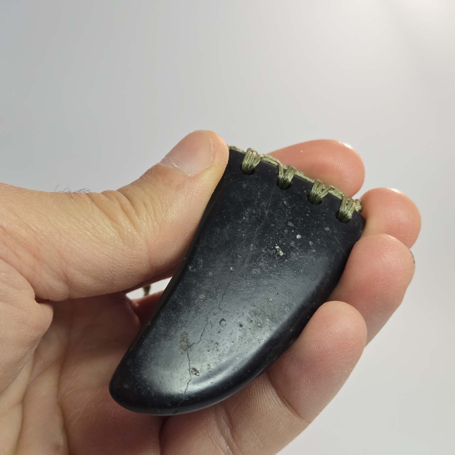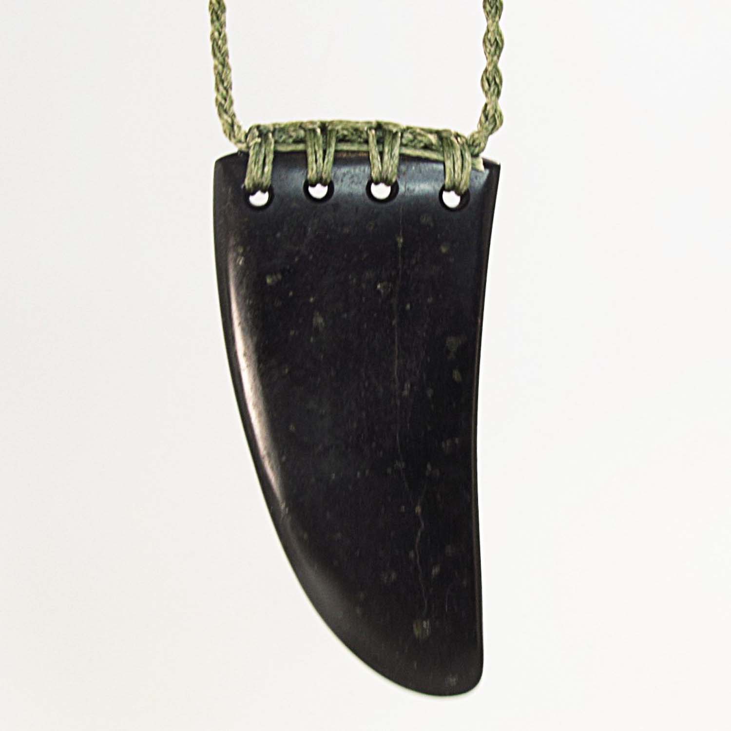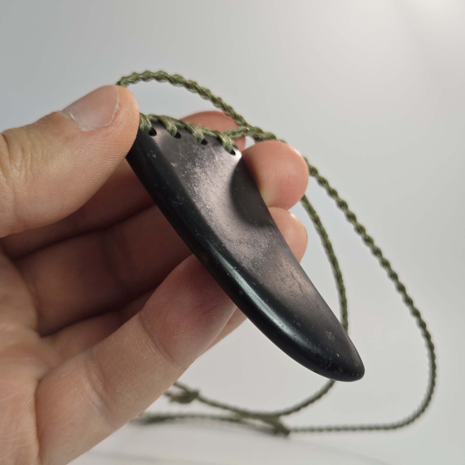 This taonga is carved from Ōnewa basalt from Whakaraupō, Lyttelton Harbour. The 65mm piece has a slender, gently curved form reminiscent of a whale tooth and is finished with a four-hole ringbolt lashing on a harakeke-green cord.