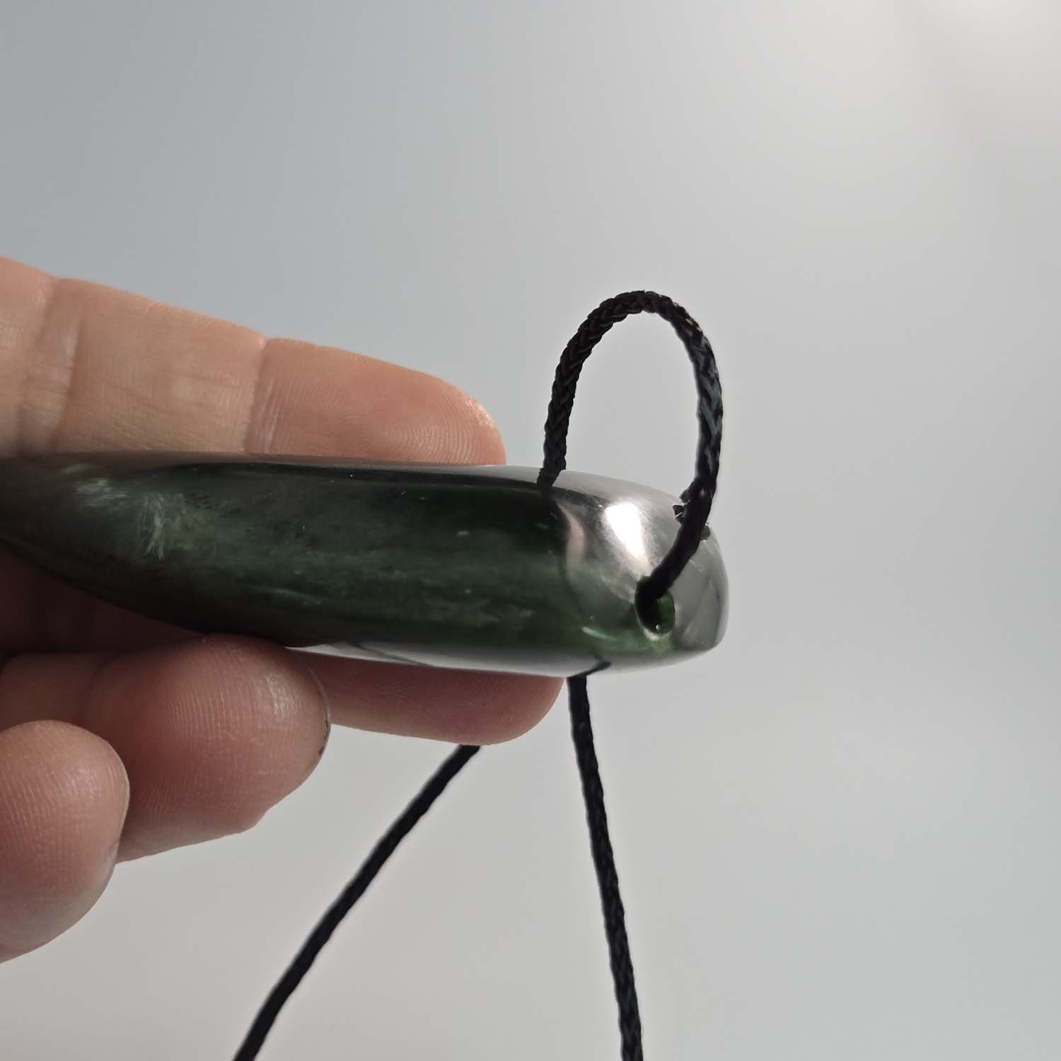 The taonga measures 75mm long and features a hidden lashing point, allowing the cord to sit invisibly behind the piece so the front remains clean and uninterrupted.